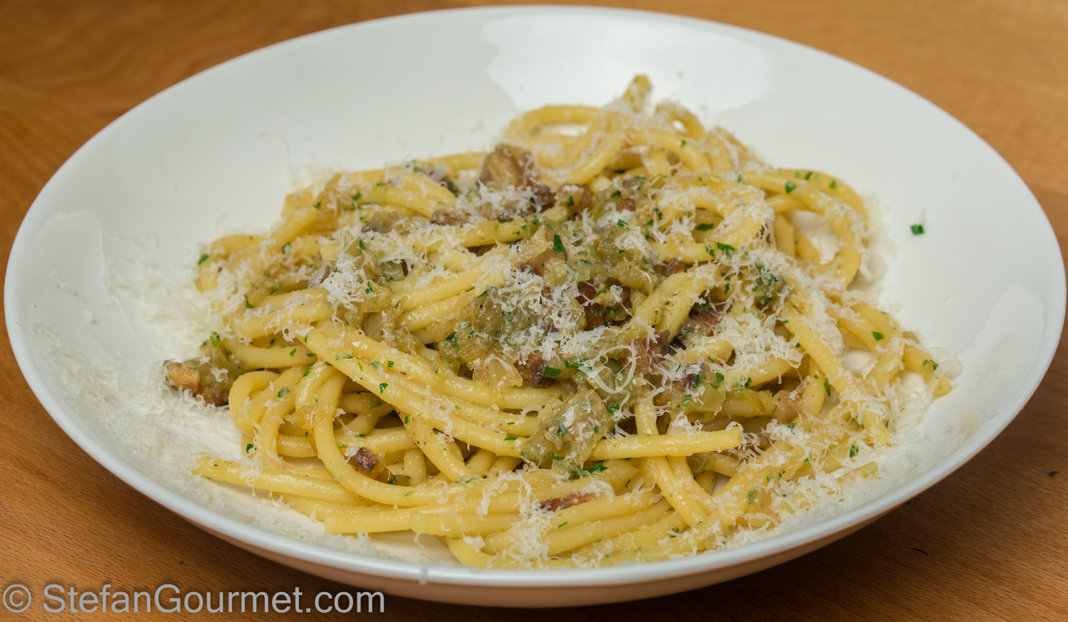 Bucatini alle cipolle is a very simple pasta dish that makes the onions shine by cooking them slowly over low heat. A bit of pancetta is added for additional flavor. The onions are cooked until they are so soft and sweet that they become a sauce.