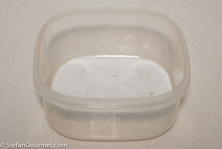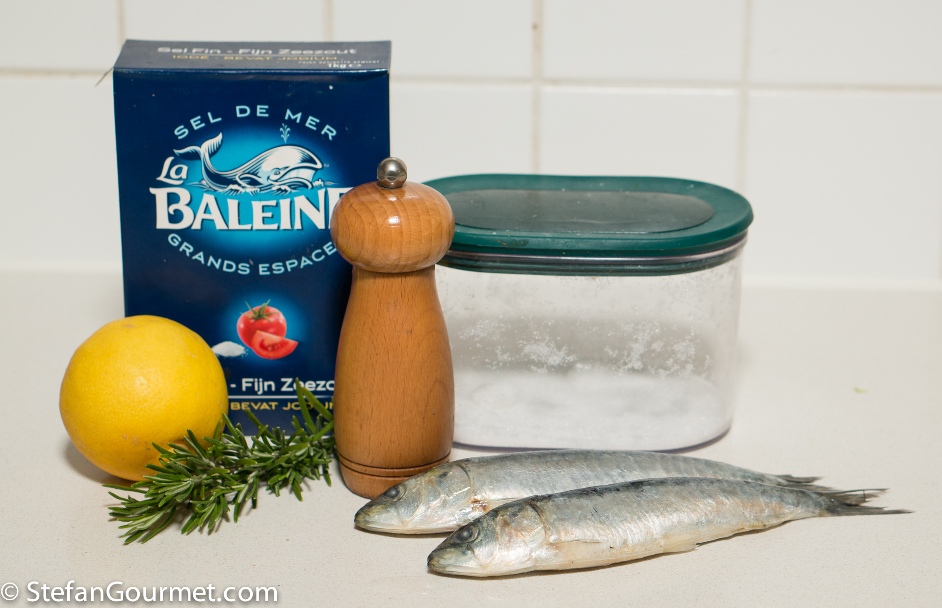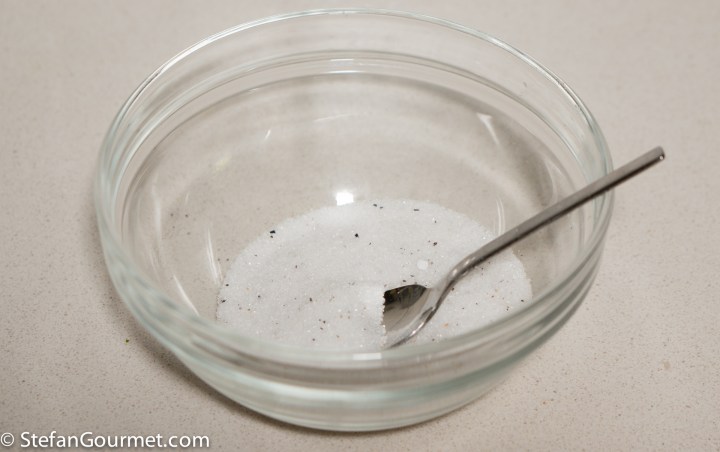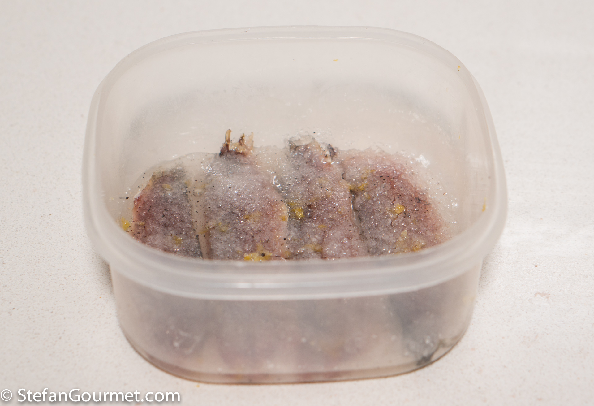 Mix salt with half the weight of sugar. For 8 sardines (16 fillets) I used 200 grams (1/2 cup table salt, more if it is flaky salt) of salt and 100 grams (1/2 cup) of sugar.