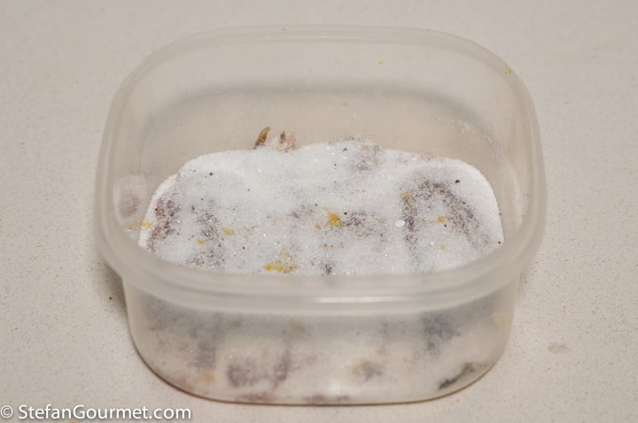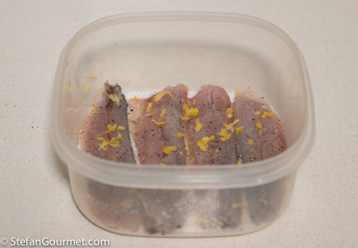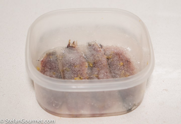 Cover and refrigerate for 45 minutes to 1 hour, not more. As the sardine fillets are thin, this is enough time to cure them all the way through. If you leave them in longer, they will become tough.