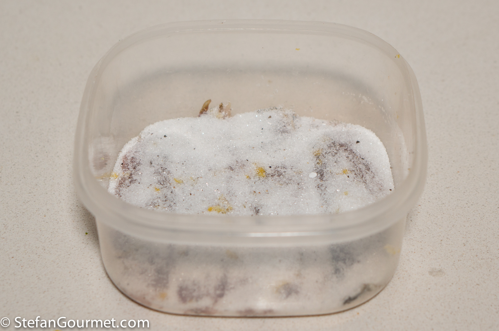 Put a thin layer of the salt and sugar mixture in a container.