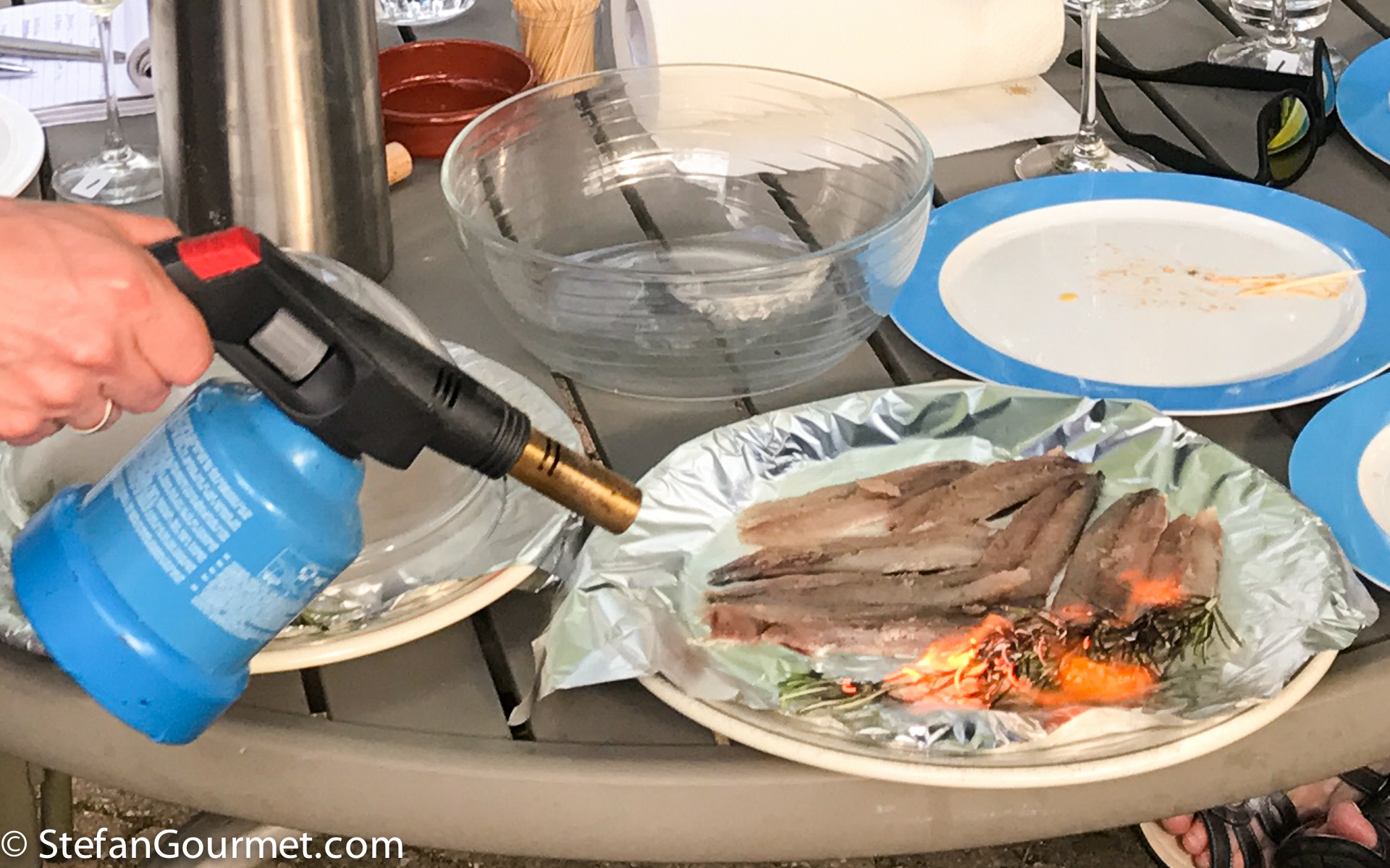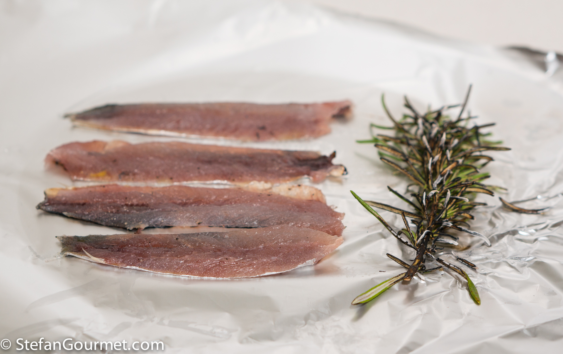 Place the sardines in a single layer, skin side down, on some aluminum foil. Place a branch of rosemary next to it and ignite it.