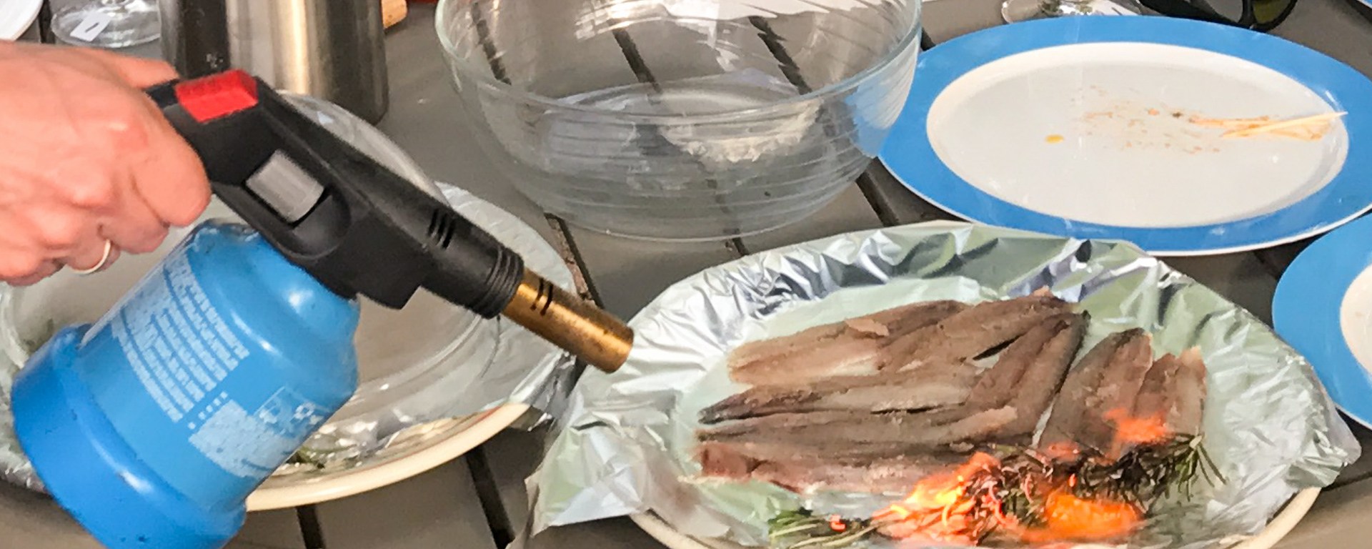 Cover the rosemary and sardines with a bowl; a transparent one is best for the visual effect. If there is not enough smoke, lift the bowl and incinerate the rosemary a bit more.