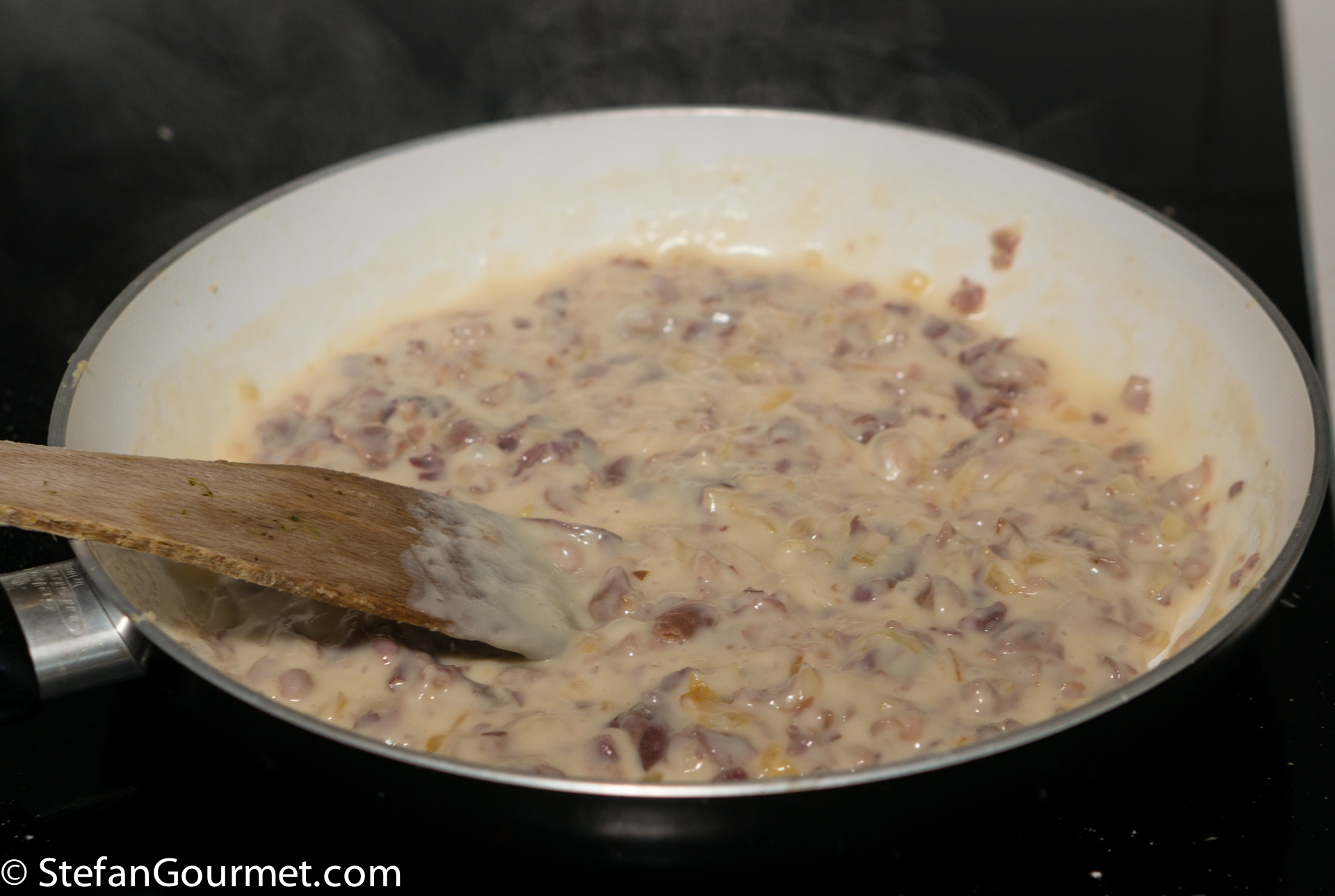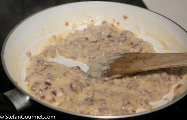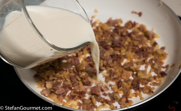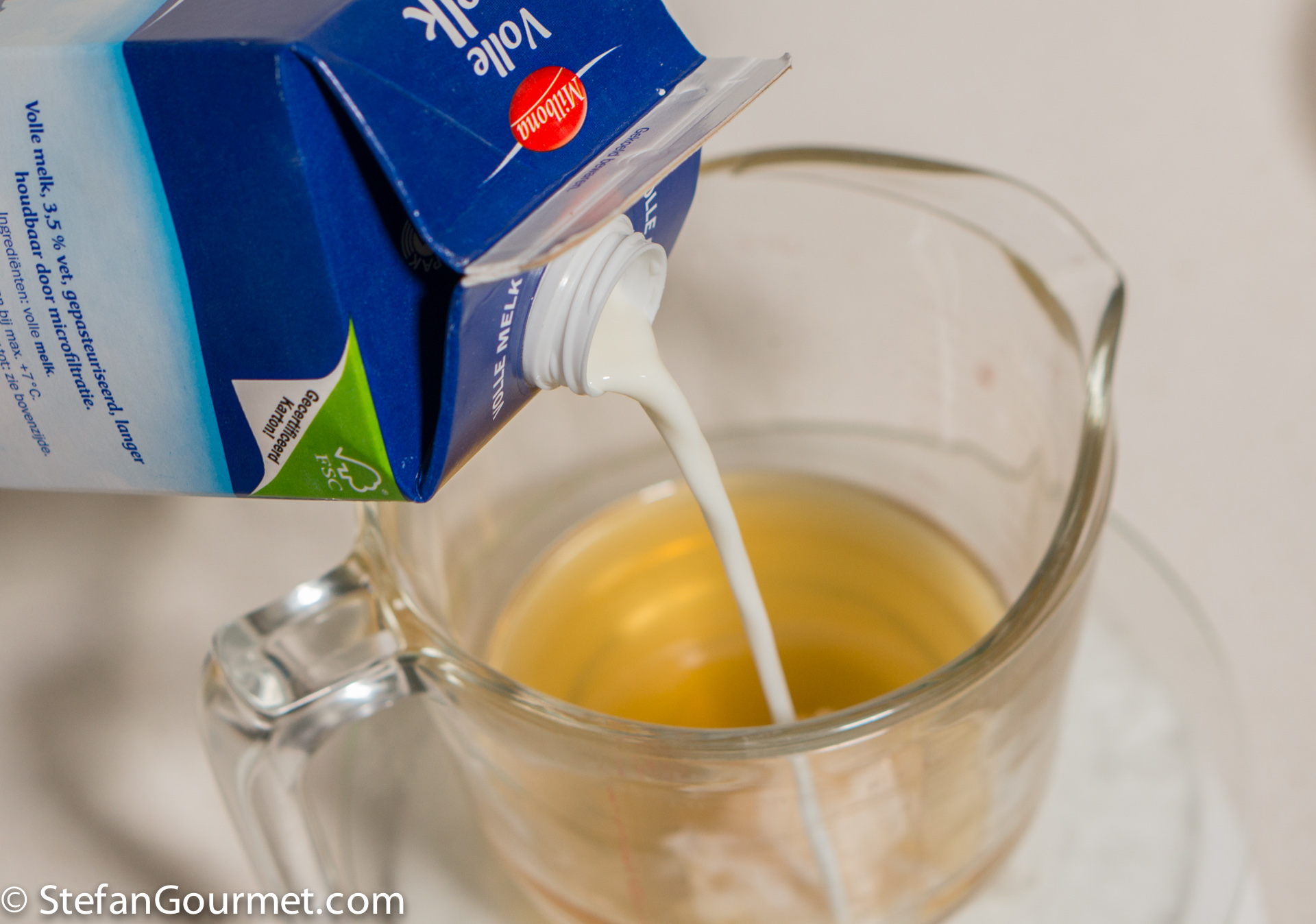 Meanwhile, combine 250 ml pork stock with 500 ml whole milk and heat this in the microwave or on the stovetop in a small saucepan. The mixture should be not but not boiling.