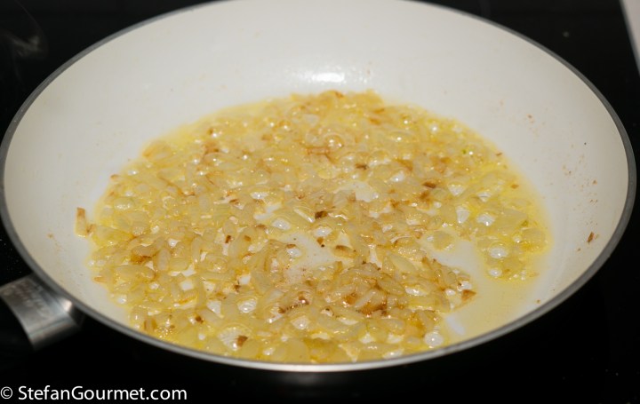 When the butter foams, add a minced onion and stir over medium heat until the onion is soft and slightly golden.