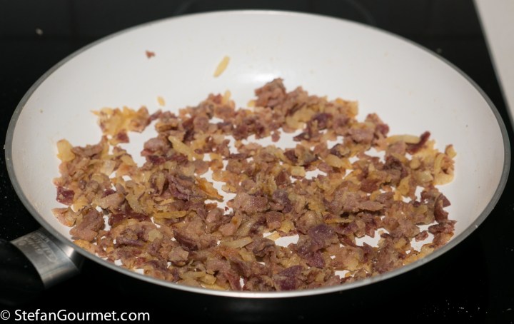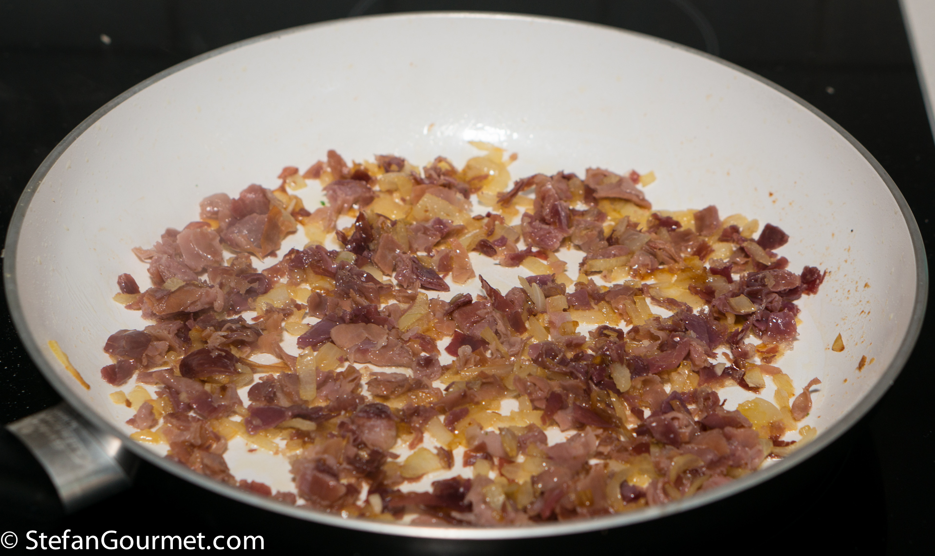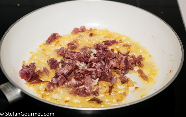 When the onion is slightly golden, add 250 grams of jamón and a minced clove of garlic.