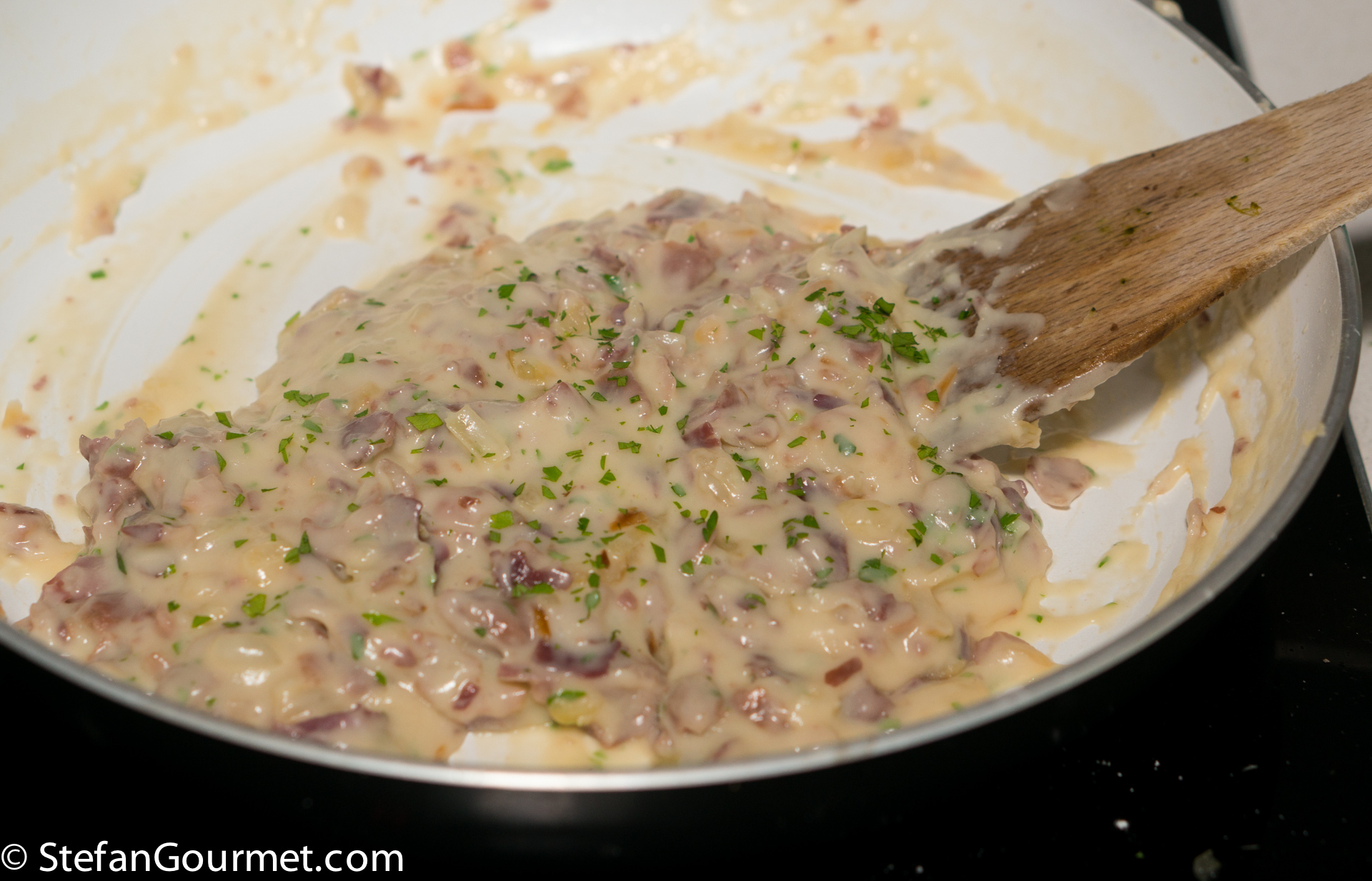 Add a tablespoon of minced parsley and stir to incorporate. Taste and adjust the seasoning with salt and freshly ground black pepper, taking into account that the ham is already quite salty.
