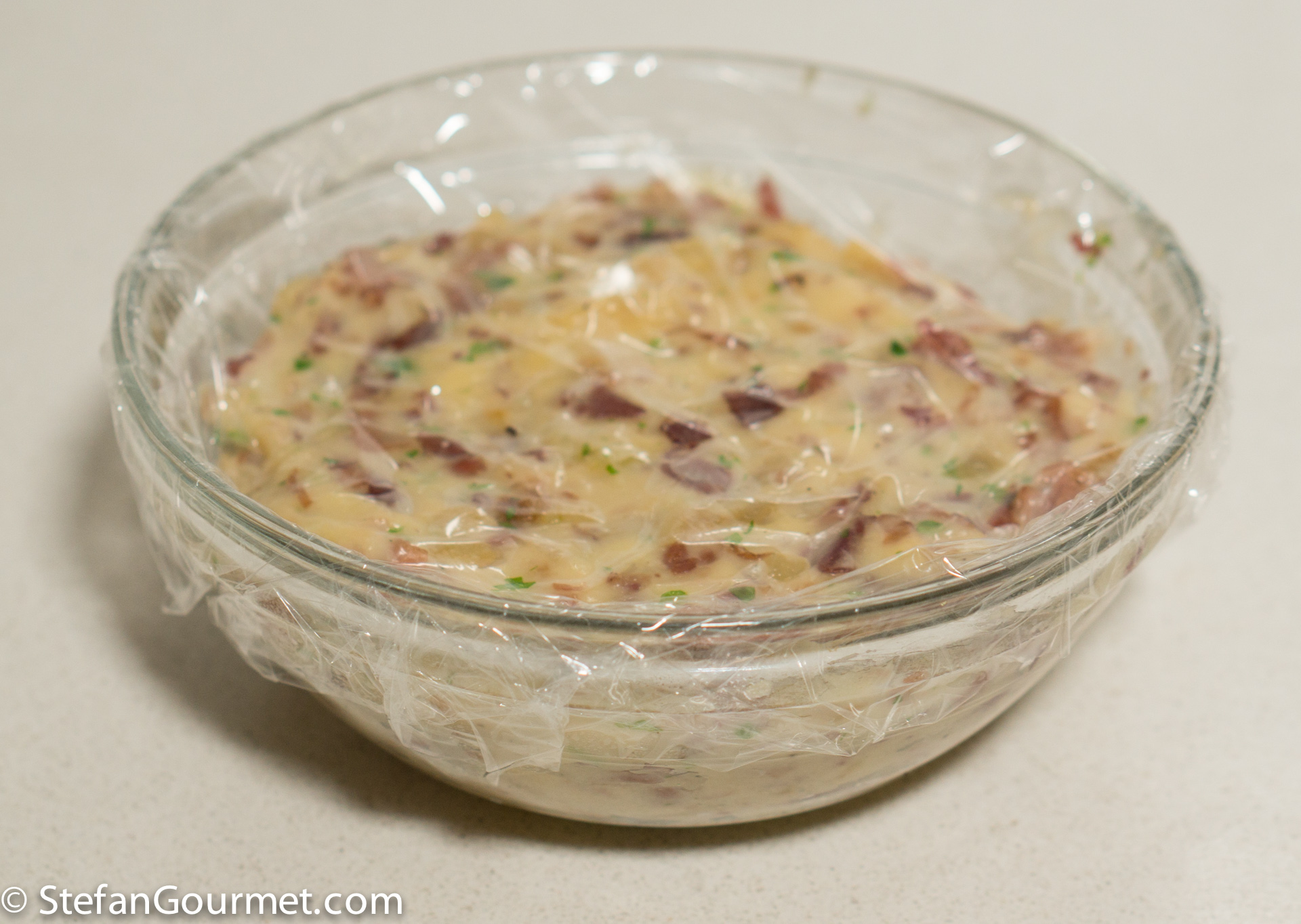Allow the mixture to cool to room temperature, then cover and refrigerate until it has firmed up completely, preferably overnight. (This was only a small trial batch so I used a medium bowl, but for the full batch I recommend using a lasagna or similar wide dish for the mixture will cool off quickly.)