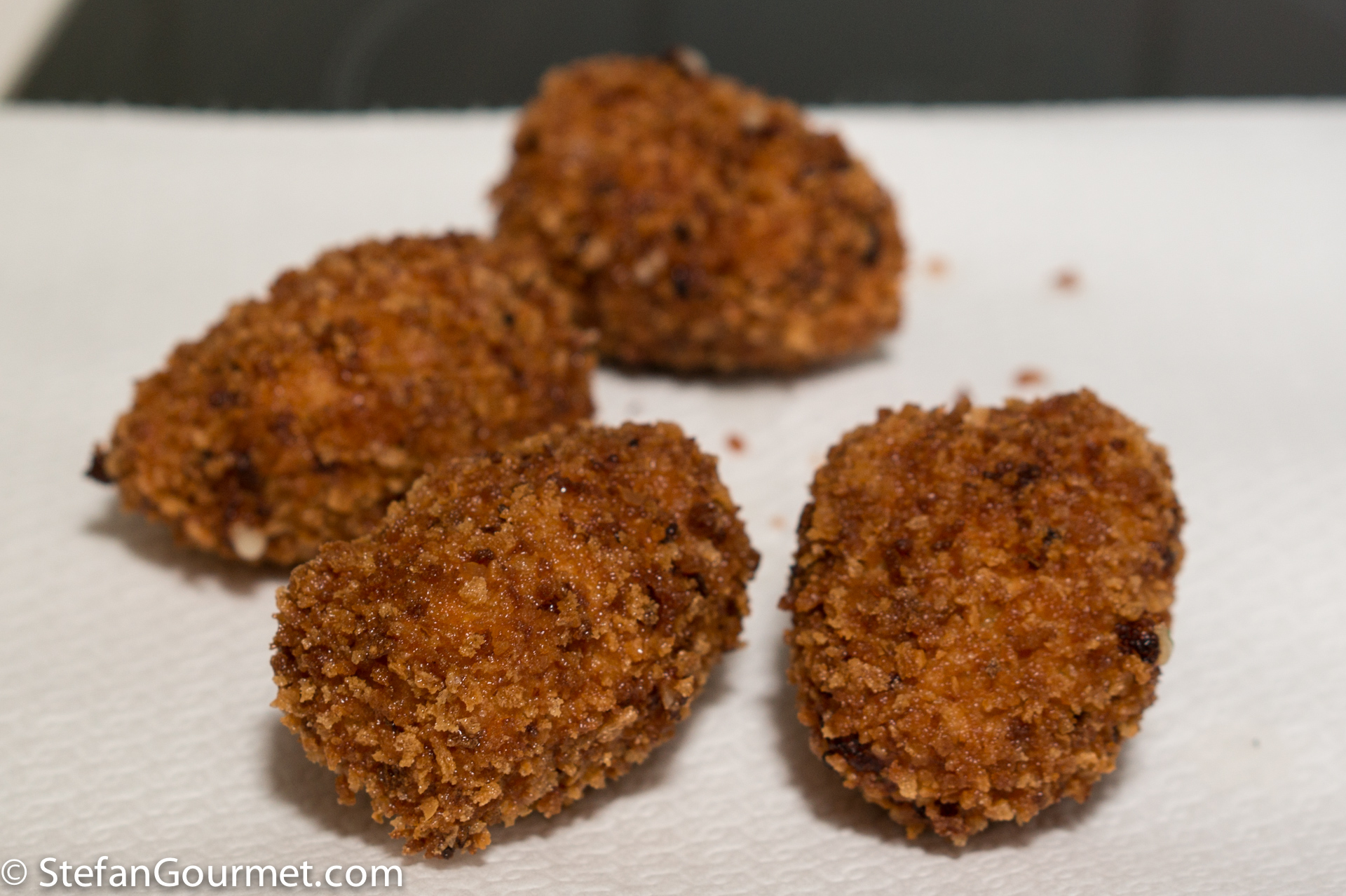 Deep fry the croquettes in oil of 180C/350F until golden brown. Fry them in batches, so the temperature of the oil does not drop by too much. If you manage to keep the oil temperature close to 180C/350F, the croquettes will hardly absorb any oil.