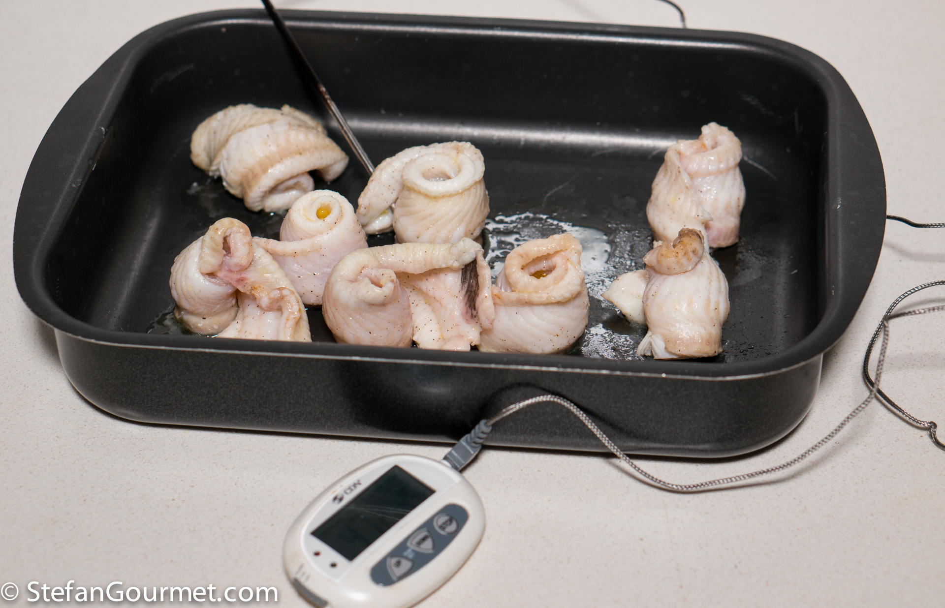 Arrange the sole rolls in an oven proof baking dish, preferably non-stick.