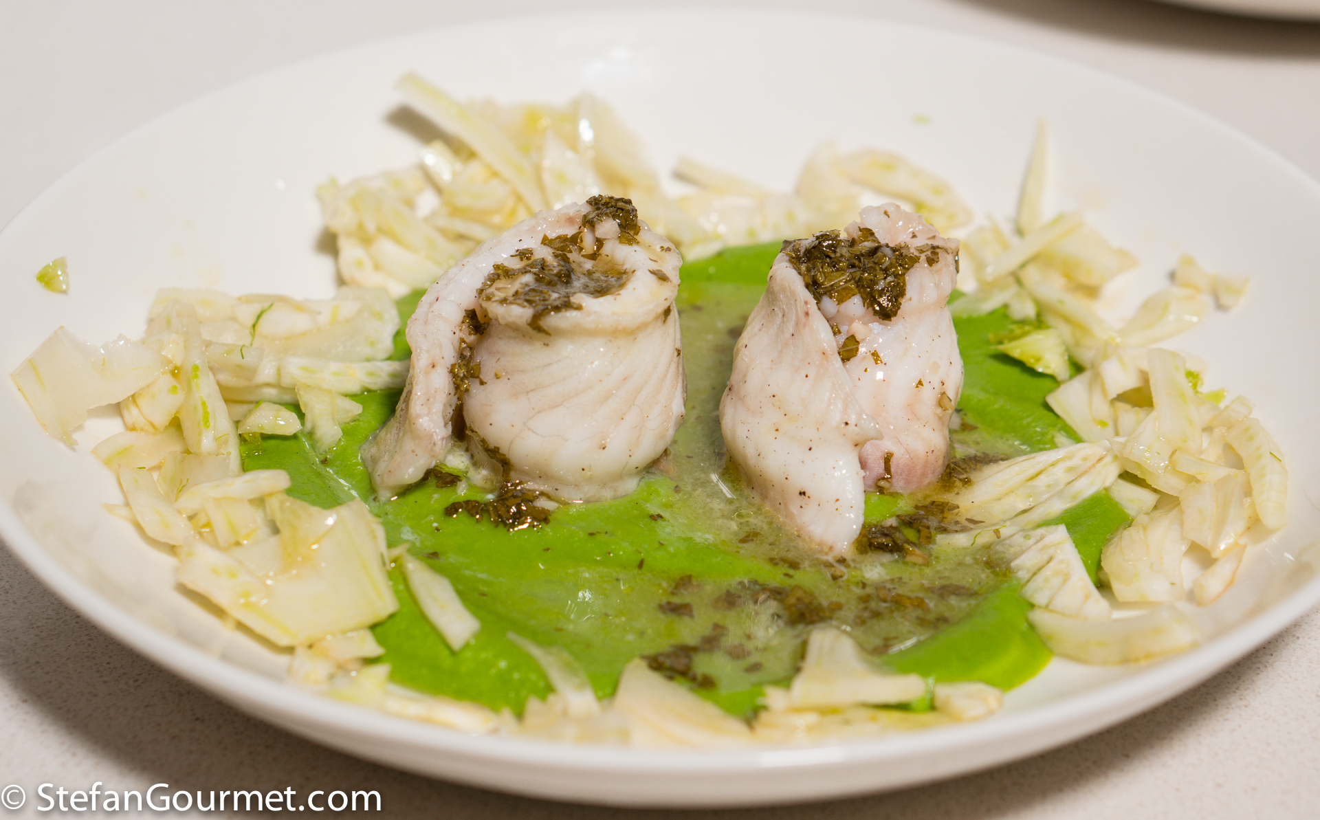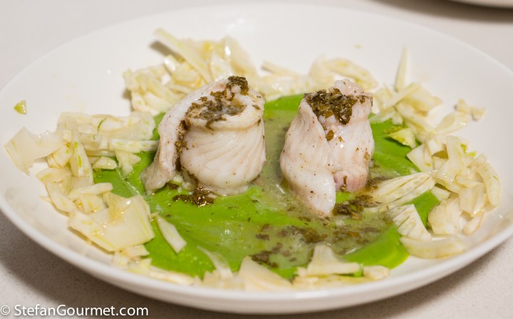 If you timed everything perfectly, you can now assemble the dish. Start with a layer of pea puree in the middle of the plate, and surround it with fennel. Arrange two sole rolls on each plate, and spoon some of the mint sauce on top of the sole. Serve at once and enjoy.