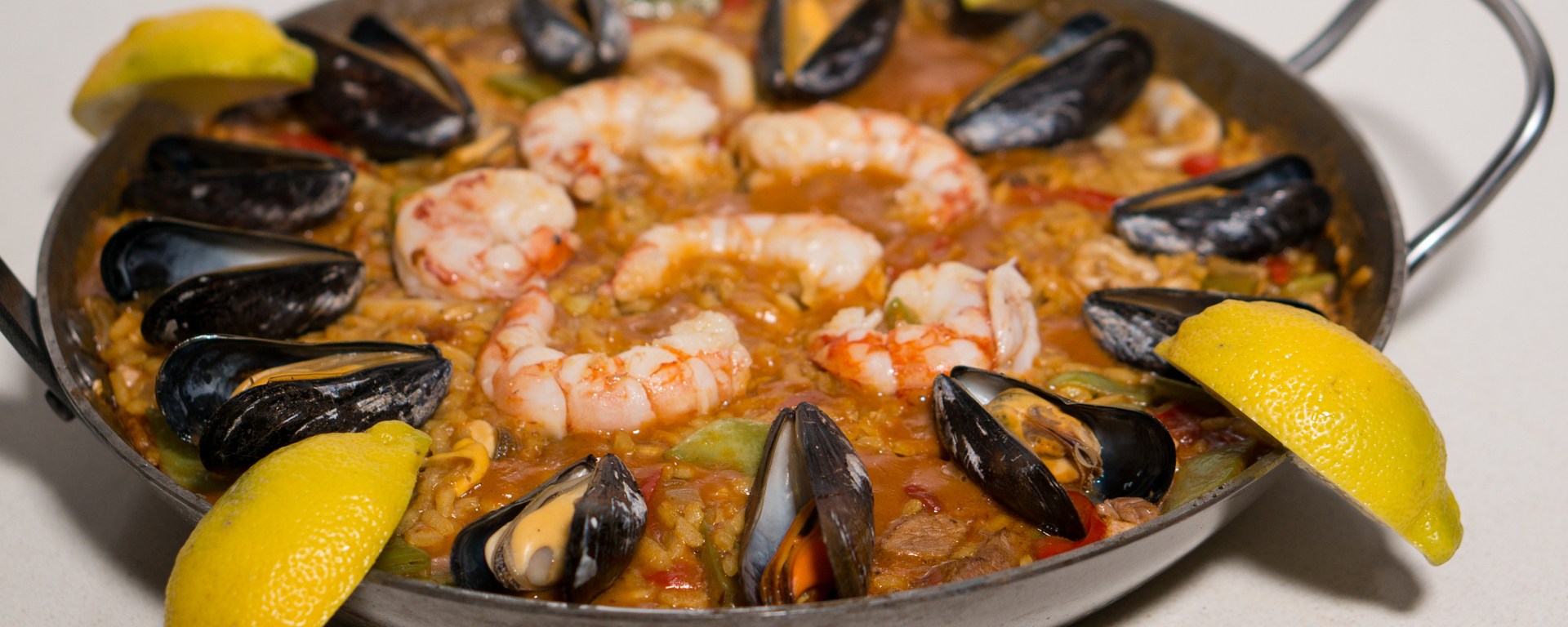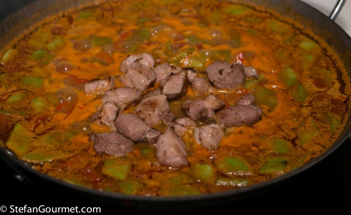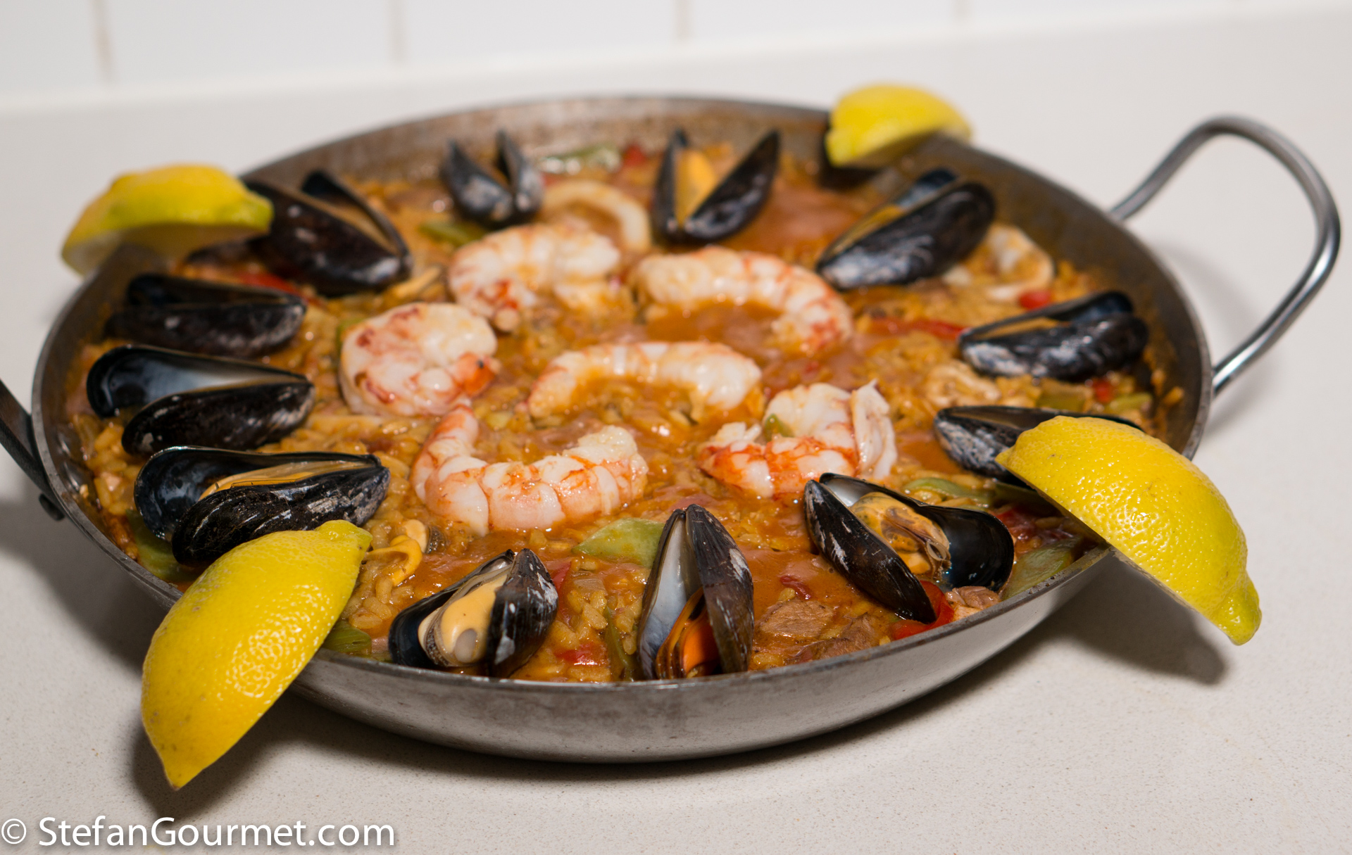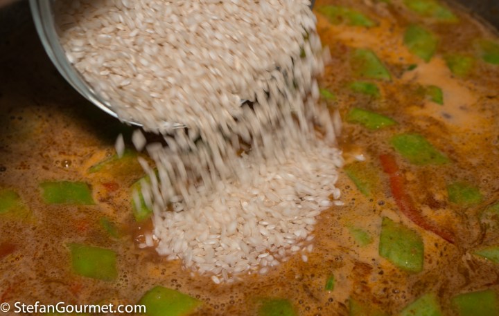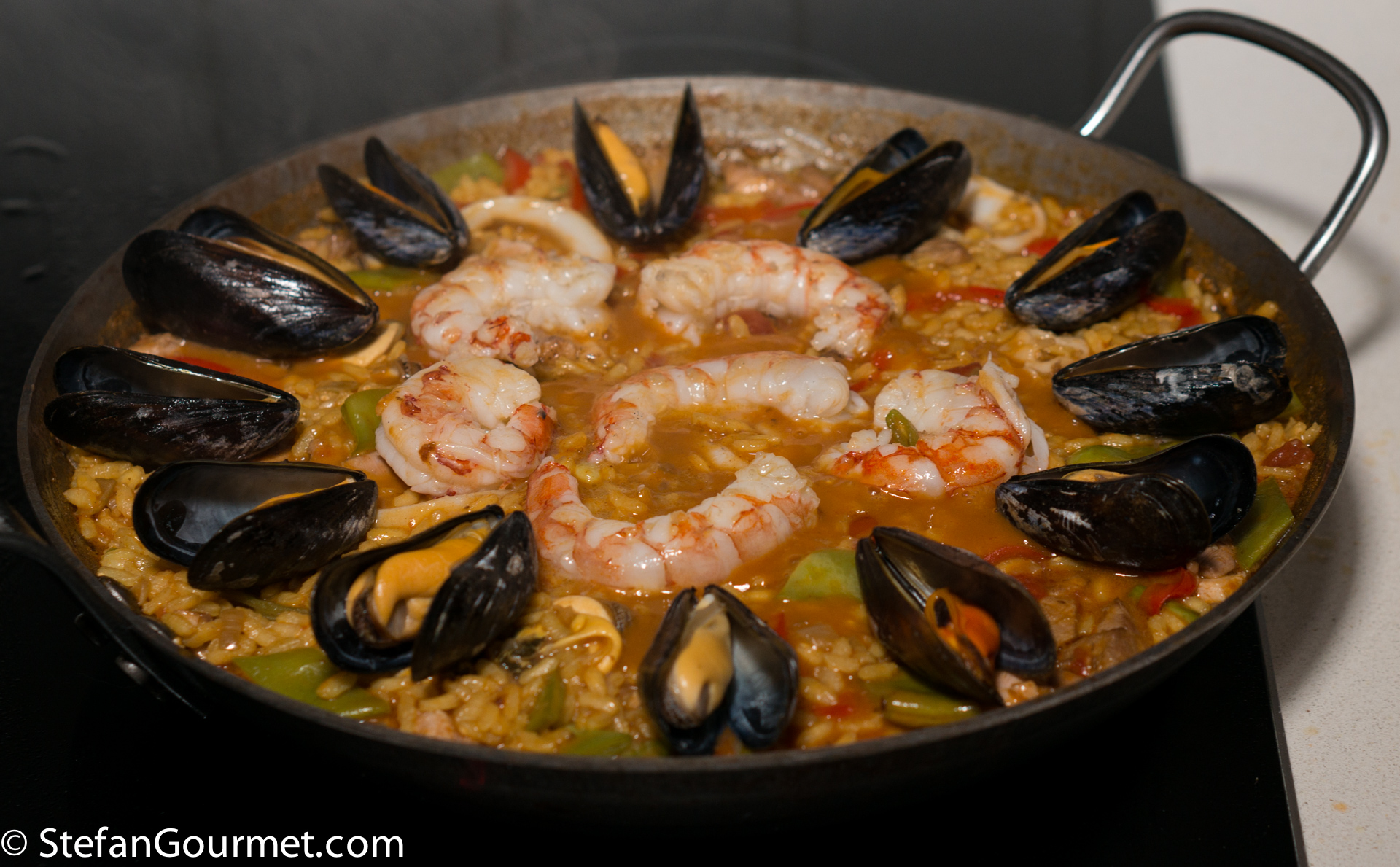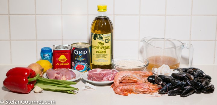 Paella is one of the best known dishes from Spain, although it is really from the Spanish city of Valencia on the Mediterranean coast. The name “paella” simply means “pan” in Valencian, although a paella pan is called a “paellera” in Spanish. There are many versions of paella, some more authentic than others, which is why Valencians think those other dishes should be called “arroz con cosas” (rice with stuff). The main versions are Paella Valenciana (meat paella with chicken, rabbit, and snails), Paella de Mariscos (seafood paella with shrimp, mussels, squid, scampi, and fish), Paella de Verduras (vegetable paella with runner beans, white beans, and artichokes), and Paella Mixta (mixed paella with meat, seafood, and vegetables). Although there are a lot of variations, chorizo is not considered to be a traditional ingredient, so paella with chorizo would fall under the “arroz con cosas” category. When making paella, the stock is very important, as that is what will flavor the rice. For this mixed paella I have also used a mixed stock: chicken stock, shrimp stock, and mussel cooking liquid. Paella was traditionally colored with saffron, but nowadays it is often substituted by food coloring because saffron has become so expensive. Luckily I just returned from Italy, where powdered saffron is still affordable.