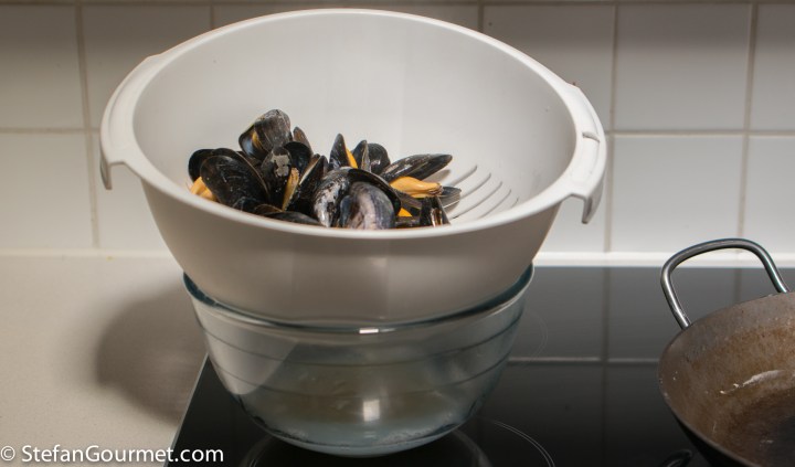 Strain the mussel cooking liquid and reserve both mussels and liquid.