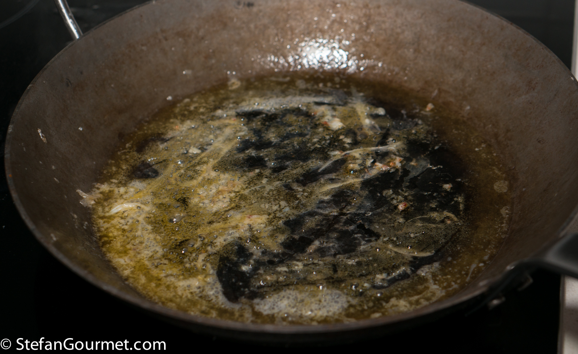Do not clean the pan, as the seafood drippings that were left behind contain a lot of flavor.
