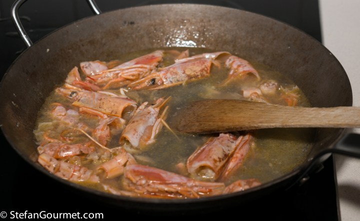 Although I have chosen traditional ingredients to make this Paella Mixta, I am ‘cheating’ a bit with the cooking technique to get an even better result. The traditional way of preparing paella is to cook all the ingredients together and to refrain from stirring. This creates optimal conditions for the “socarrat” to form, a layer of toasted rice at the bottom of the pan that adds an additional layer of flavors and textures to the paella. But it comes at the price of overcooked (dry) meat and seafood. In the recipe below I have compromised between cooking the meat and seafood correctly and still creating somewhat of a socarrat. Another difference with most recipes is that I peel the shrimp before cooking. This has two advantages: (1) it allows us to make a stock out of the heads and shells, which adds a lot of flavor to the rice, and (2) your guests won’t have to peel the shrimp. The only drawback is that unpeeled shrimp look better, but I think that is a small price to pay.