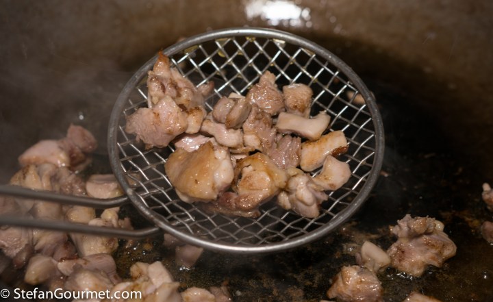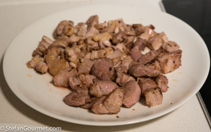 Cut the pork into pieces. Sauté the pork in the same pan as the chicken, without cleaning it, for 1 minute over high heat. Add a bit more olive oil if needed. Again, this is just about browning and not about cooking the pork through.