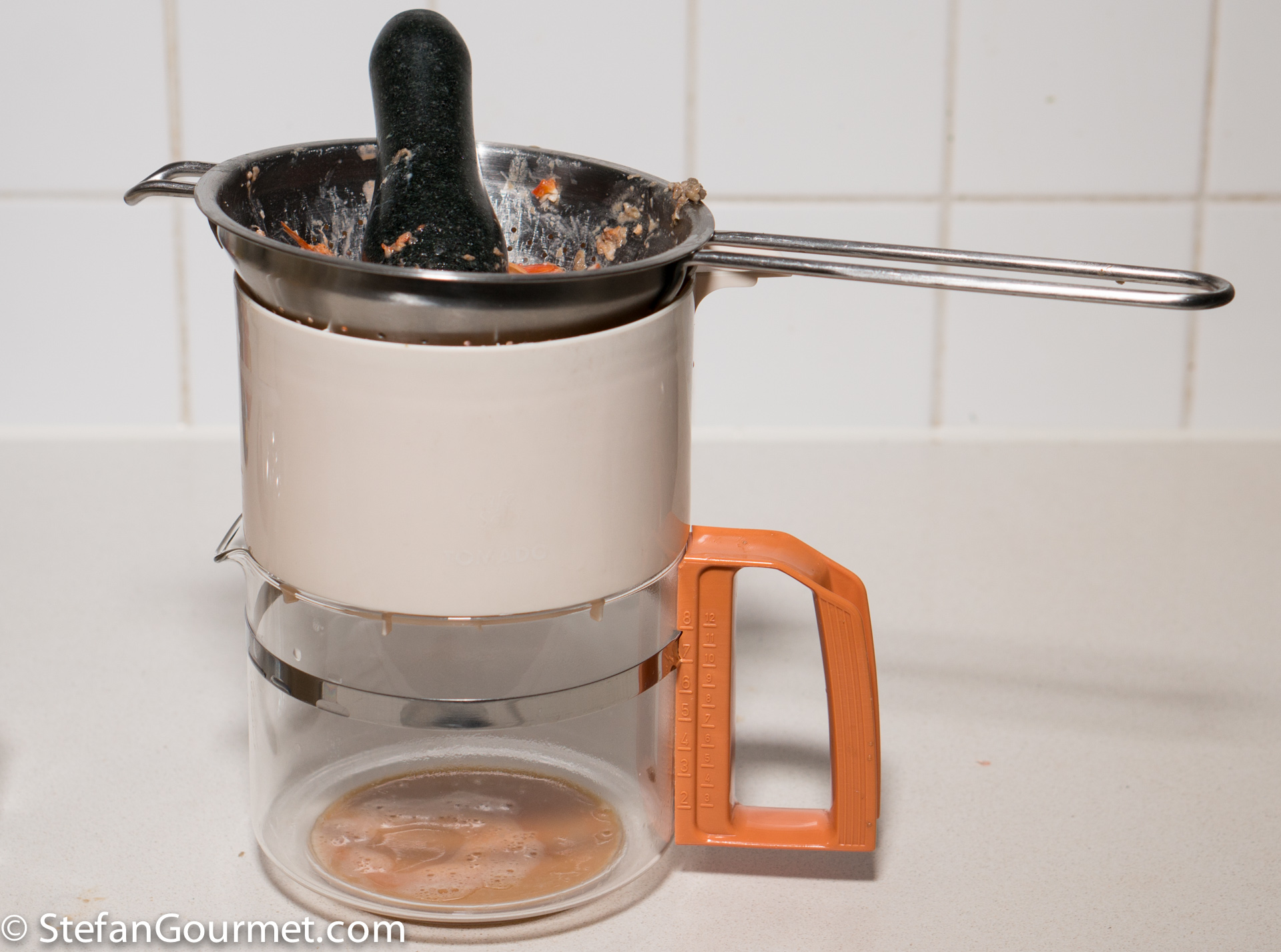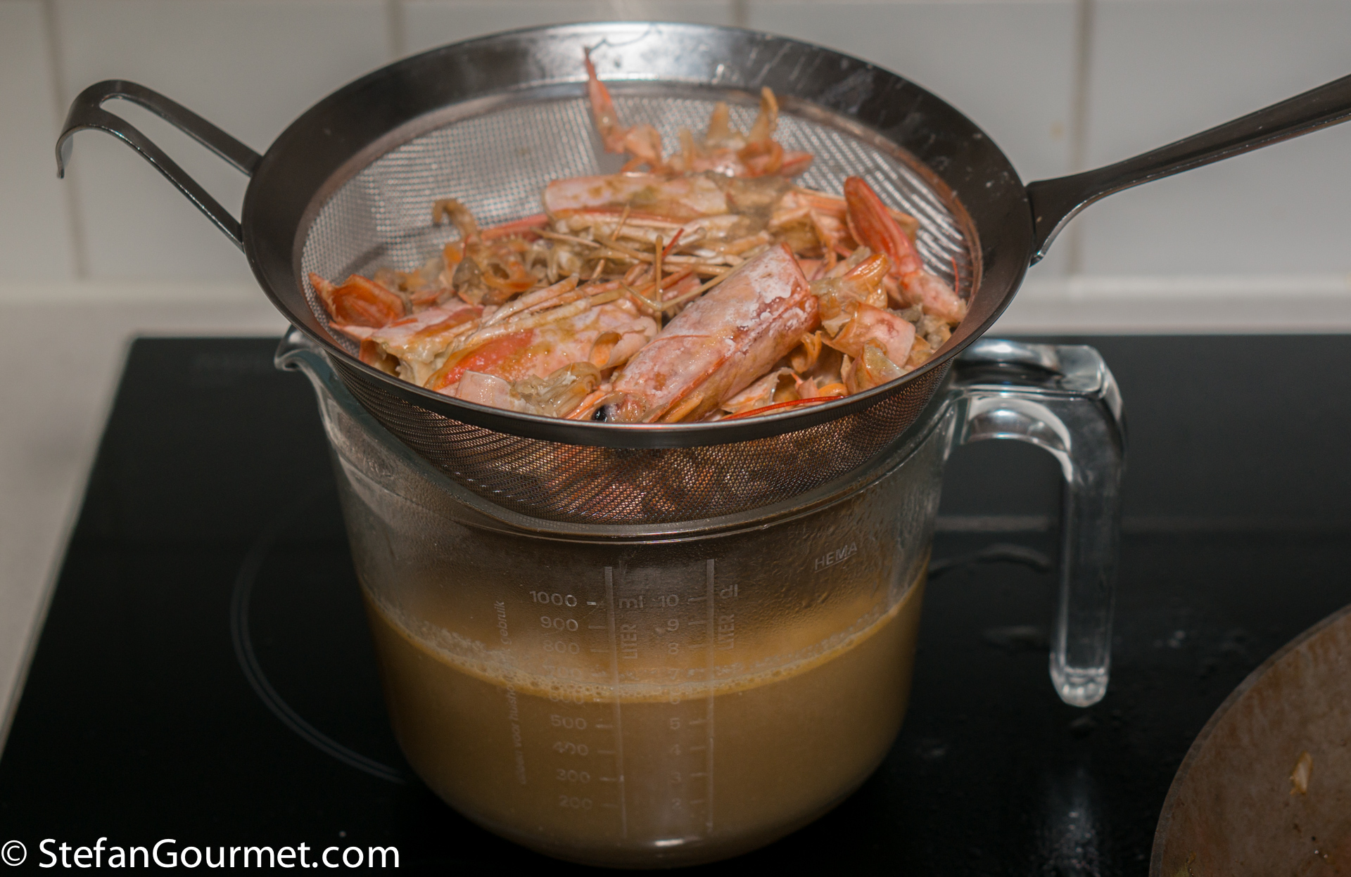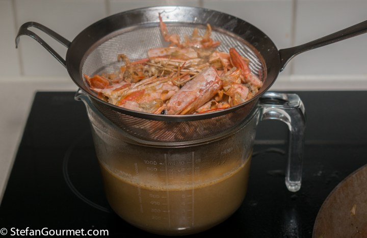 Use a chinois and a pestle to push as much liquid out of the shrimp heads and shells as you can, as there is a lot of flavor in there, and add this to the stock as well.