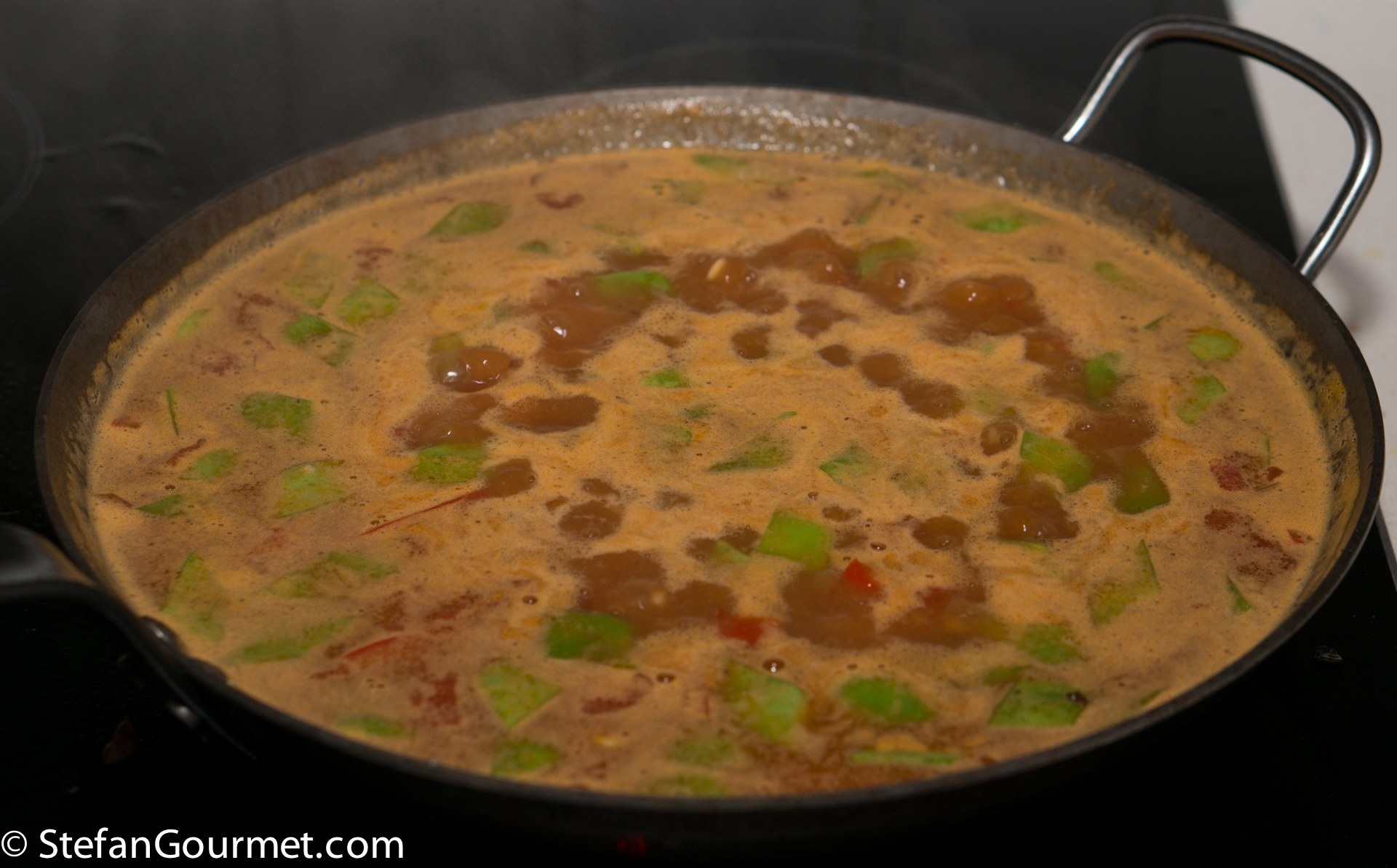 Add the red bell pepper strips and stir for a couple of minutes over medium heat.