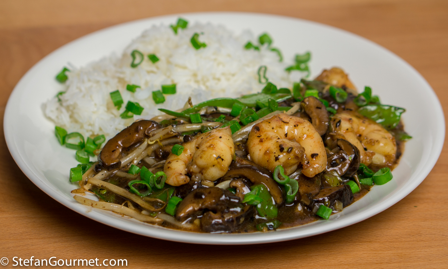 Shrimp and mushrooms are a classic combination in stir fry dishes. In this Chinese-style dish, I’ve added another layer of flavor by braising dried shii take mushrooms in oyster sauce first. It is a bit more work, but worth it. Tender juicy shrimp with slightly chewy flavorful mushrooms and crunchy vegetables combined with a delicious sauce with fermented black beans, garlic, ginger, chilli, and green onions, this is very tasty indeed.