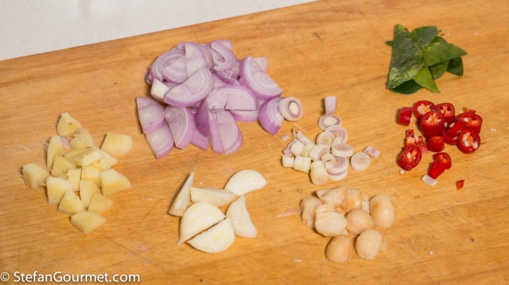 Prepare 1 lemongrass, sliced (part with purple inside only), 2 cloves garlic, chopped, 4 lime leaves, 4 Tbsp chopped shallots, 1 Tbsp chopped ginger, 1 red chilli pepper, sliced, and 1 Tbsp macadamia nuts.