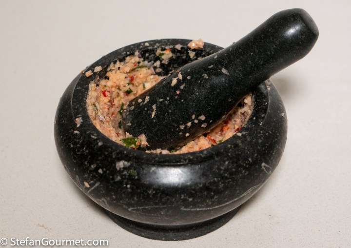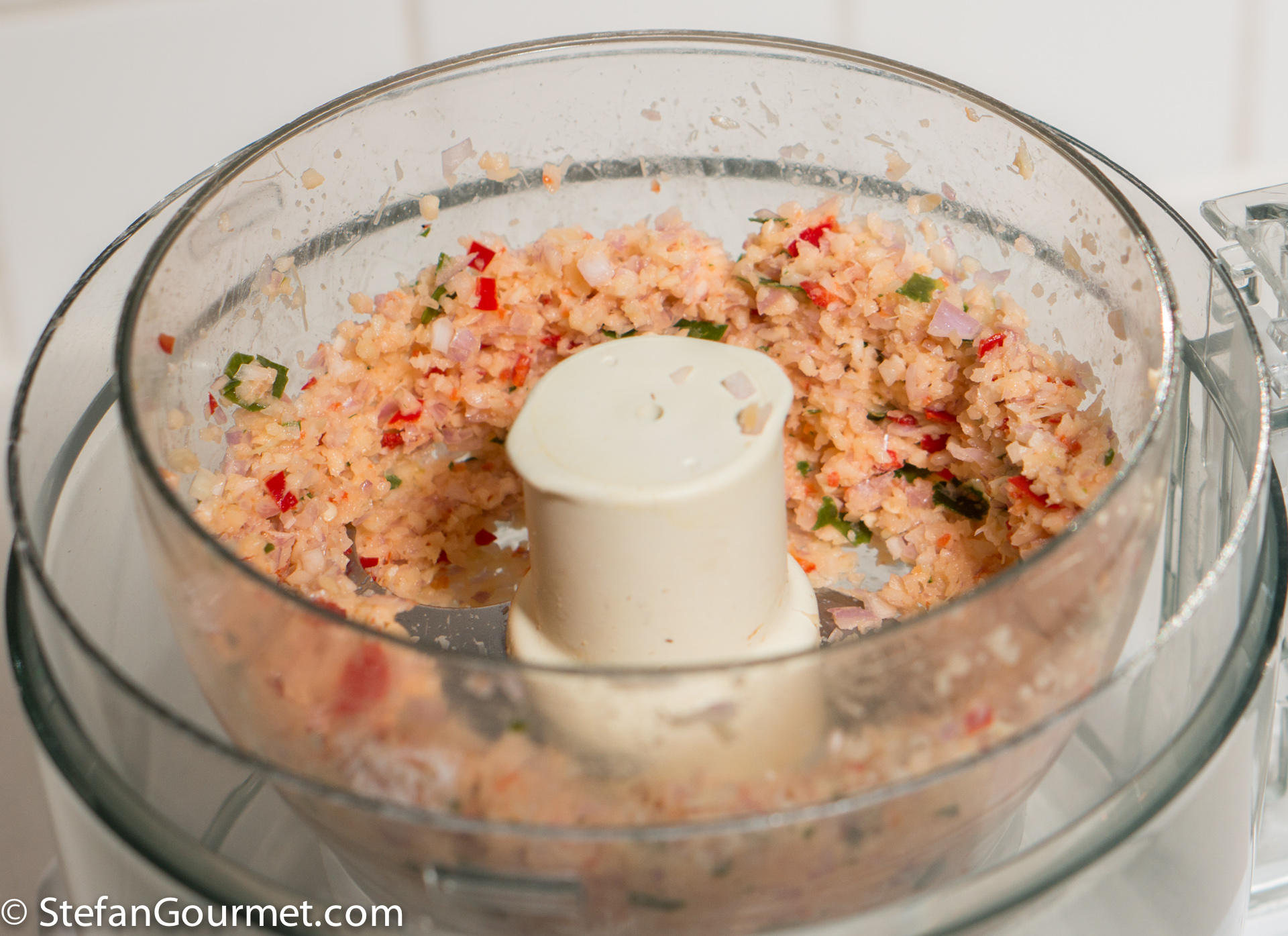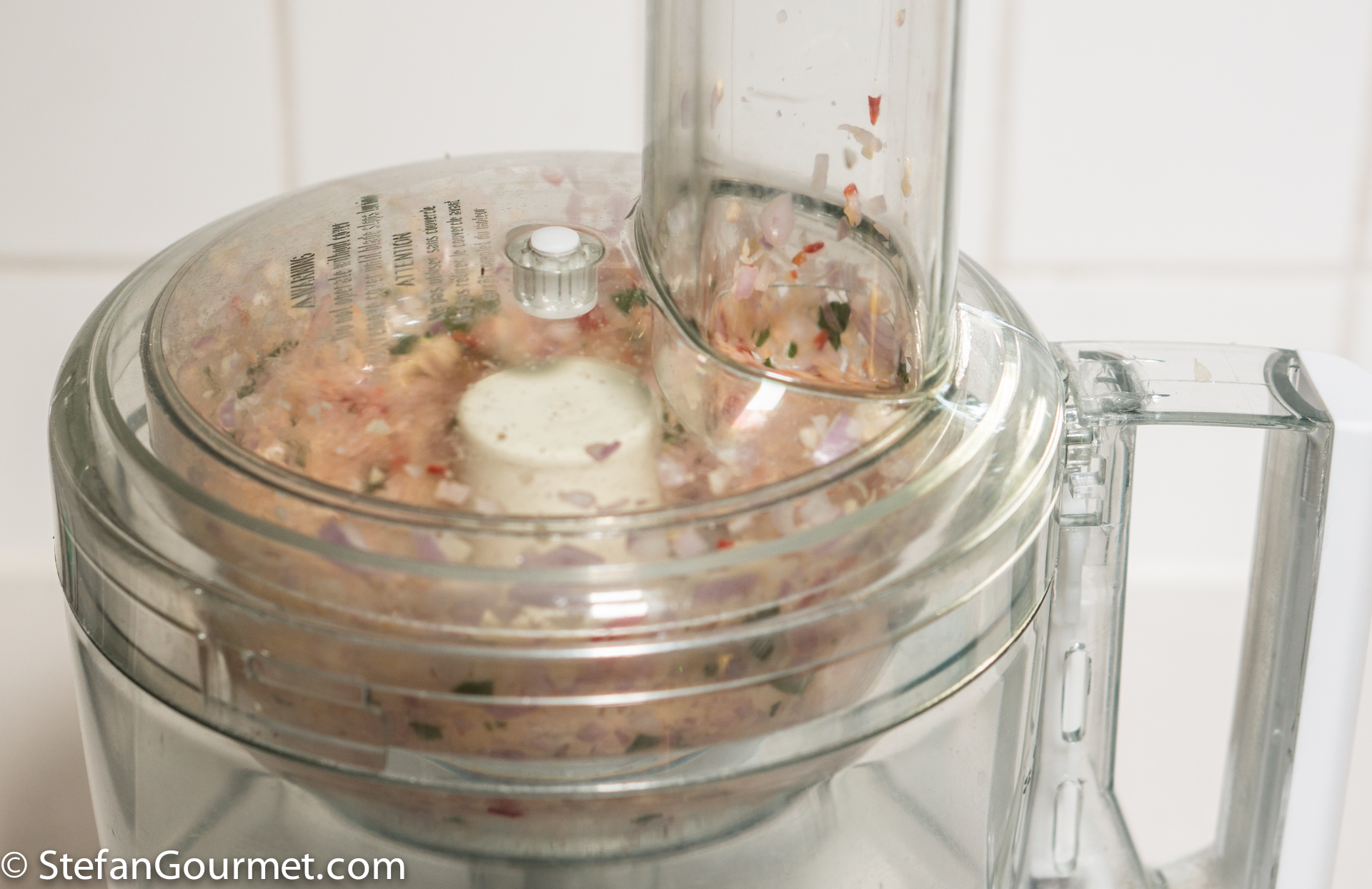 You are supposed to make a bumbu using a mortar and pestle, but I like to start in the food processor…