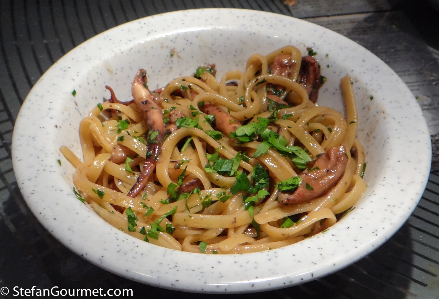 Moscardini, baby octopus, cooked sous-vide is great over pasta. Just like regular octopus, the moscardini release a flavorful liquid that I used to make a simple pasta sauce. The result was very tasty indeed, with great depth of flavor.
