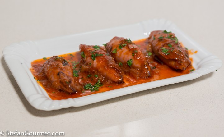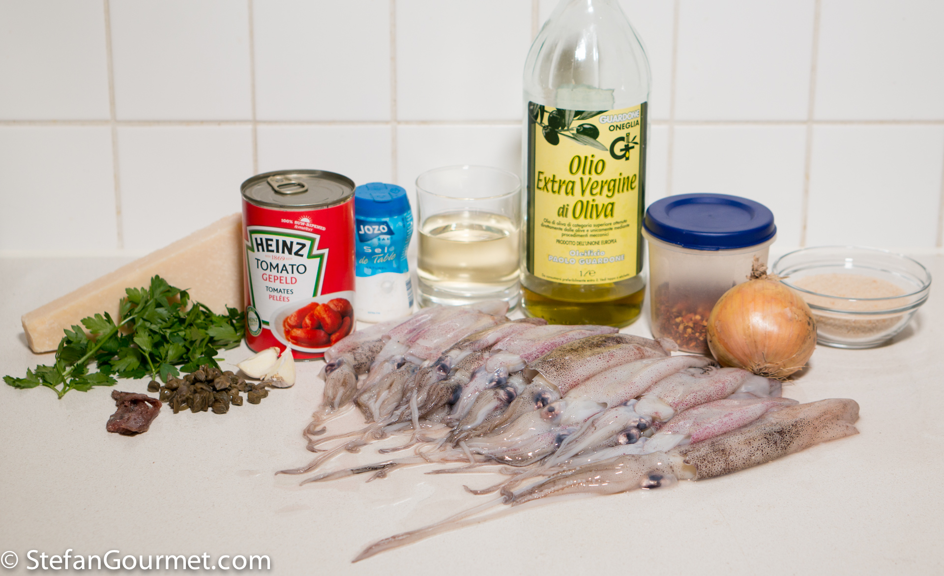 I prepared this recipe for two Italian friends that live in Amsterdam and came over for dinner, and they both raved about how good it was. (They tend to give positive reviews on everything I cook for them, but this was exceptional with lots of “Che bontà!” and the like.) The calamari are filled with a mixture that contains their tentacles as well as the aforementioned parmigiano, capers, and anchovies, and they are braised slowly in tomato sauce. The calamari end up very tender and the tomato sauce is amazing, so make sure to have good Italian bread to mop up the sauce (fare la scarpetta, as they say in Italy). If you have any sauce leftover, it would be wonderful to dress spaghetti or linguine. You can serve these calamari either as antipasti or as secondo.