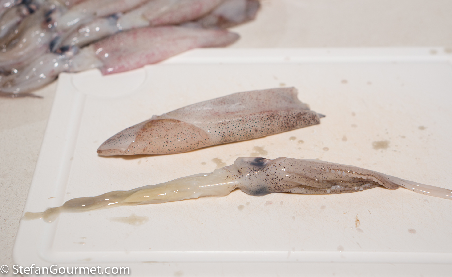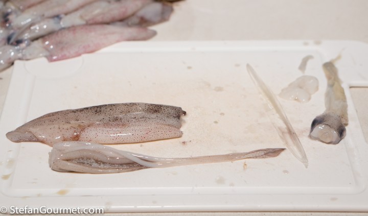 Then cut off the tentacles just below the eyes. Keep the tentacles and discard from the eyes upwards. With your fingers, remove anything you find inside the body, including the transparent bone.