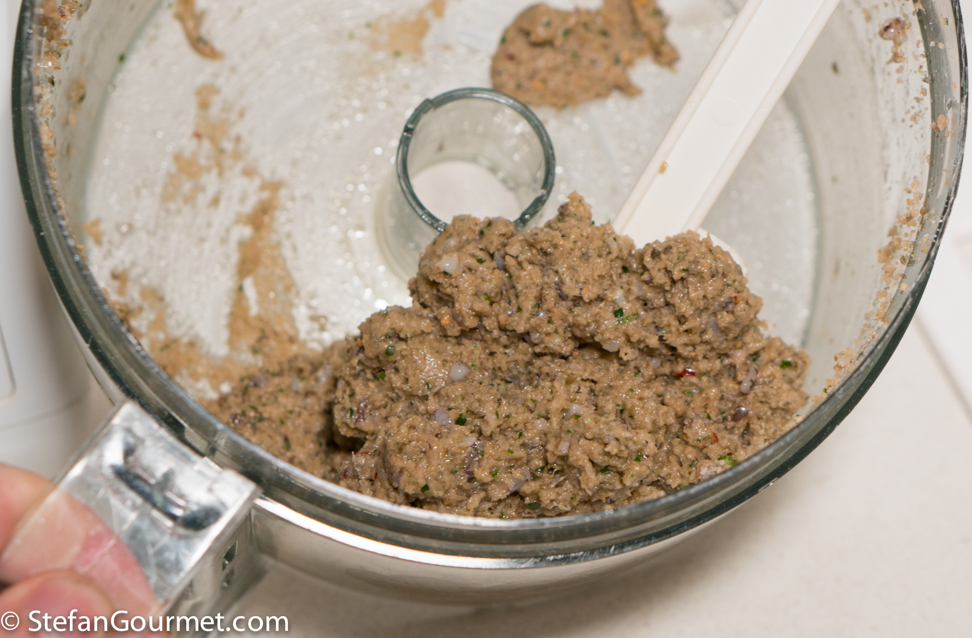 Reserve the bodies for now. Put the tentacles in the food processor together with 1/4 tsp chilli flakes (peperoncino), 1/4 tsp salt, 4 Tbsp (60 ml) extra virgin olive oil, 15 grams (1/3 cup) freshly grated parmigiano reggiano, 50 grams (1/3 cup) dried breadcrumbs, 1 Tbsp minced flat leaf parsley, 1 garlic clove (chopped), 3 anchovy fillets (chopped), and 1 Tbsp capers (rinsed and dried). Process until smooth.