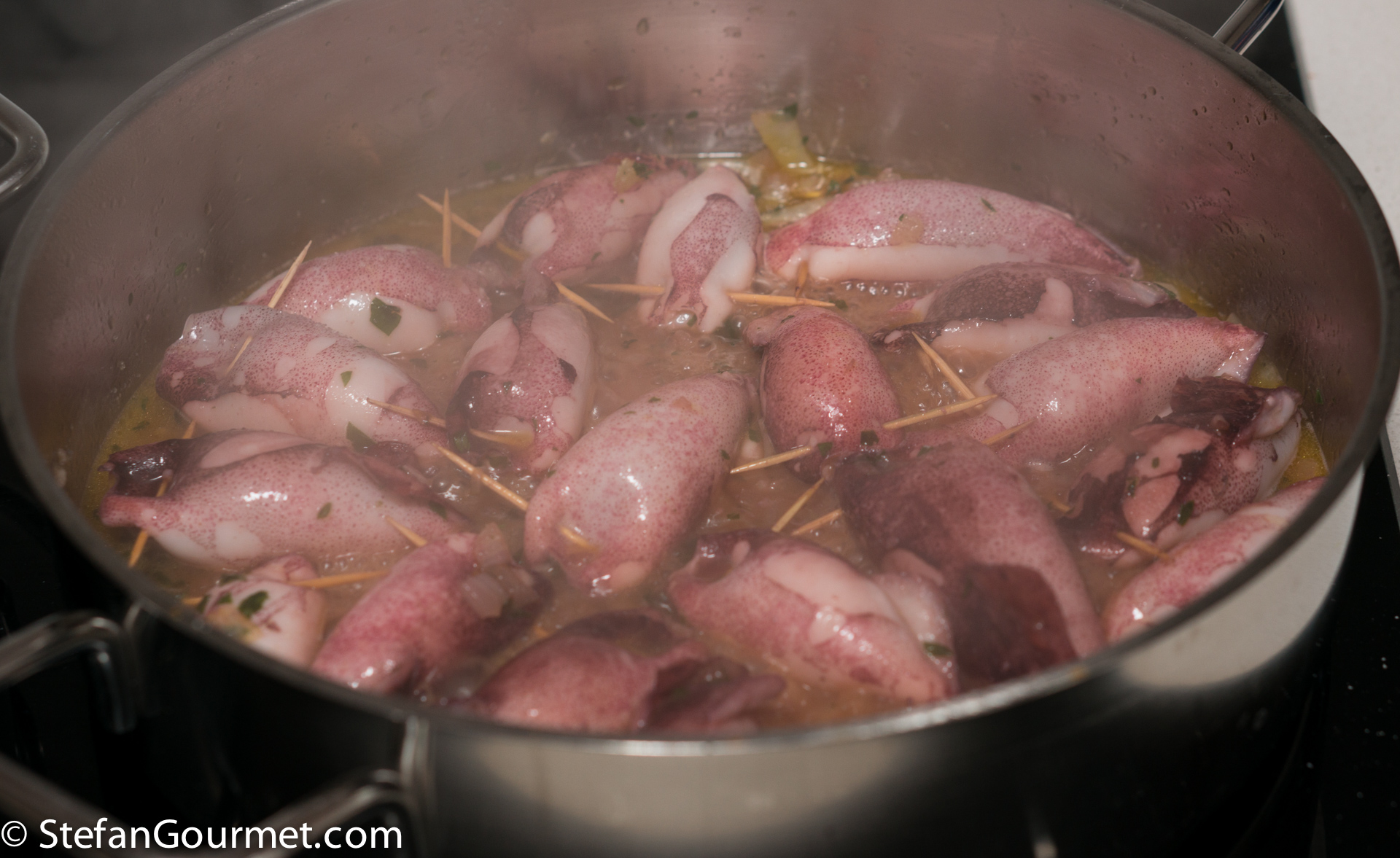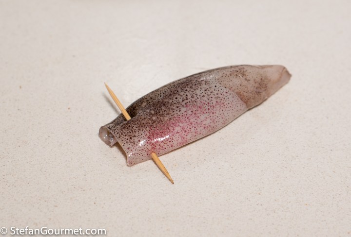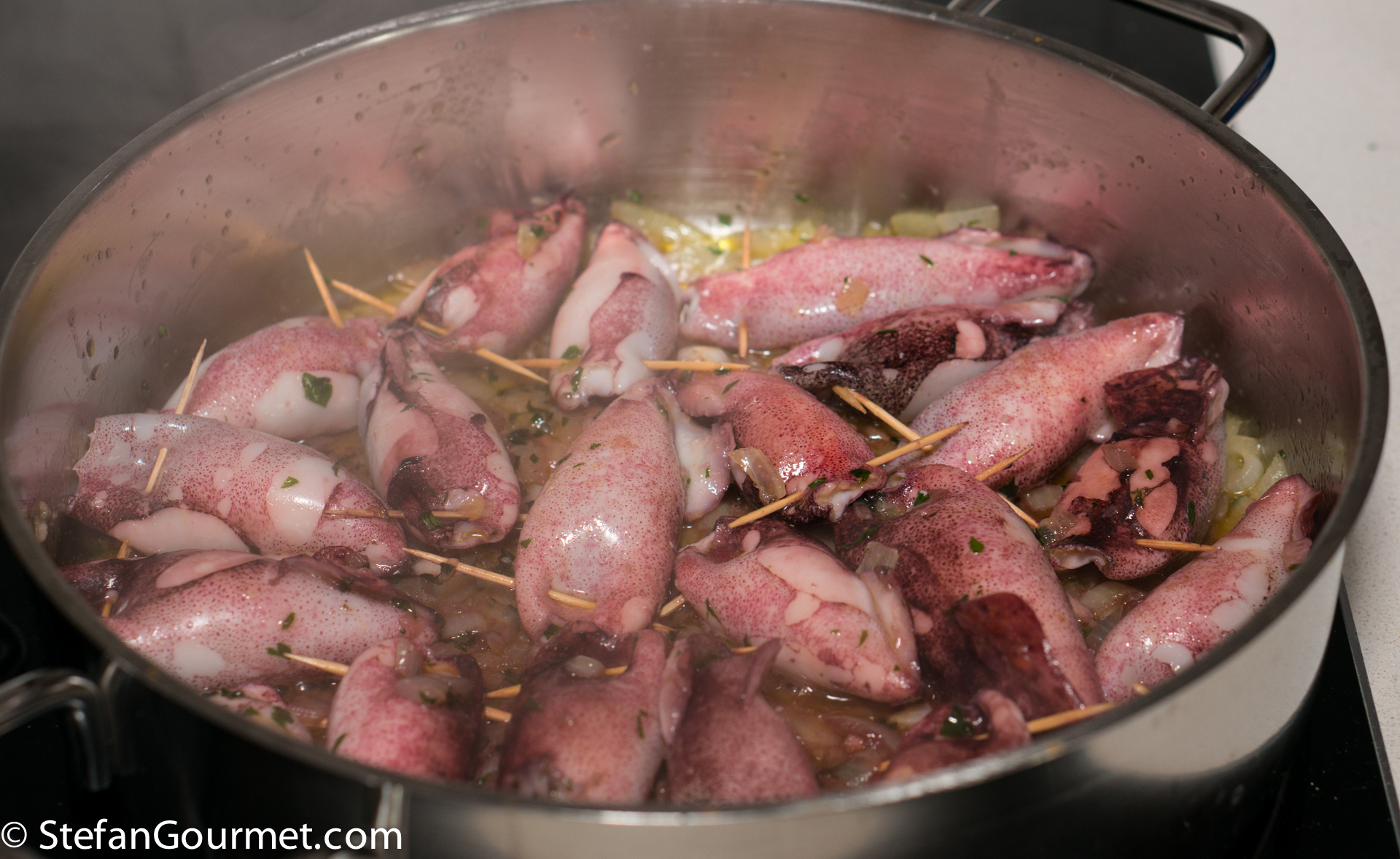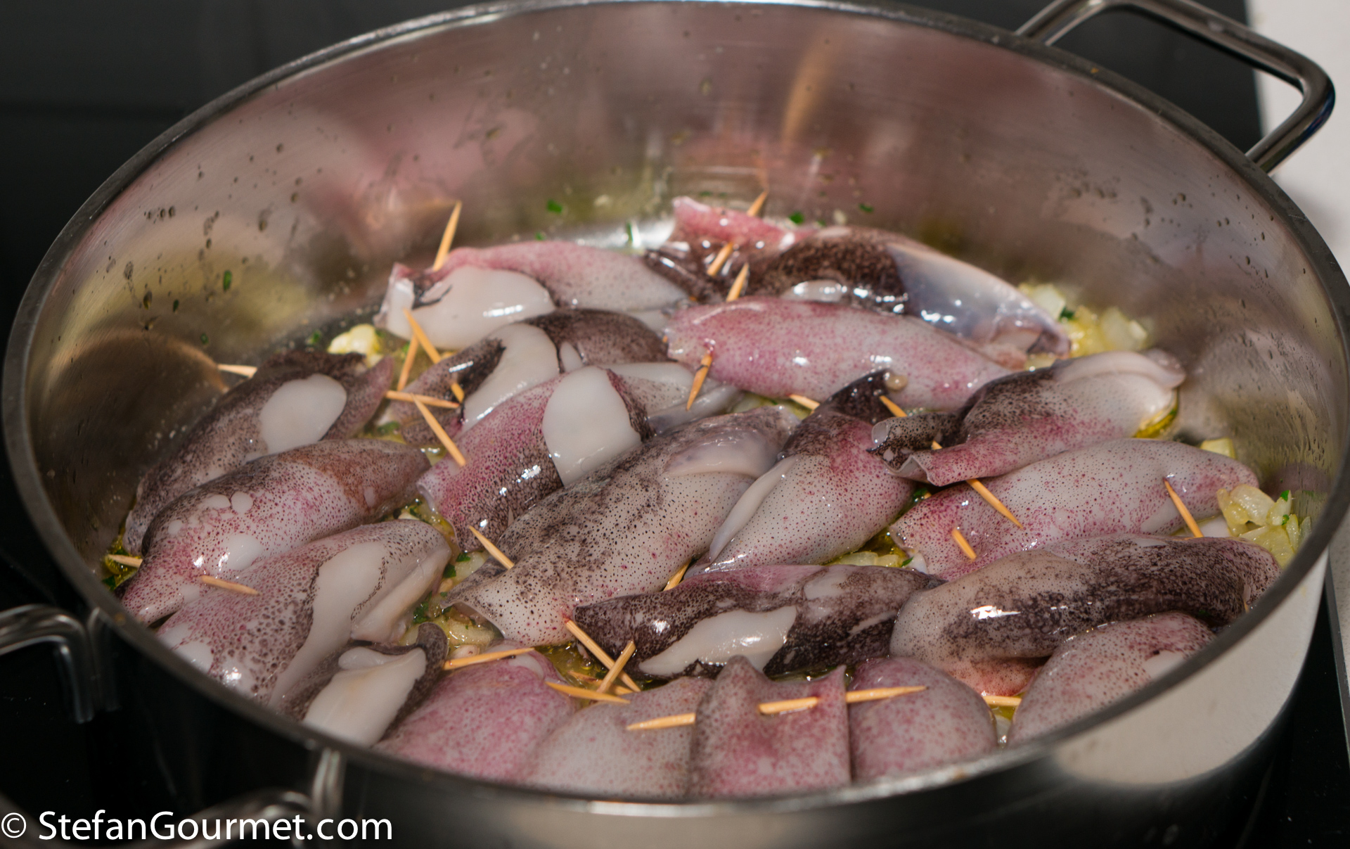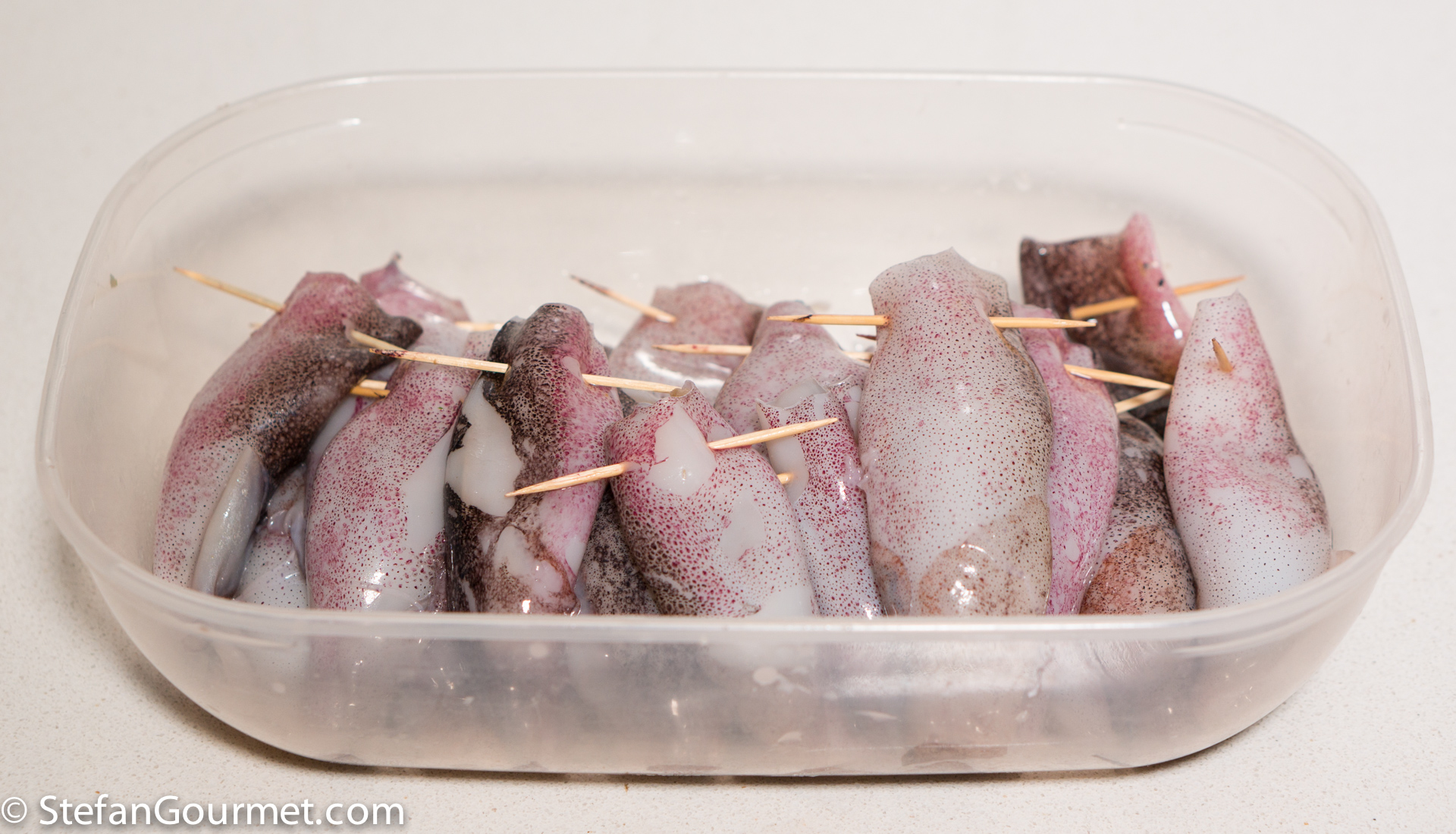 Keep going until you have stuffed all of them. You can prepare everything up to this point in advance and refrigerate the stuffed squid.
