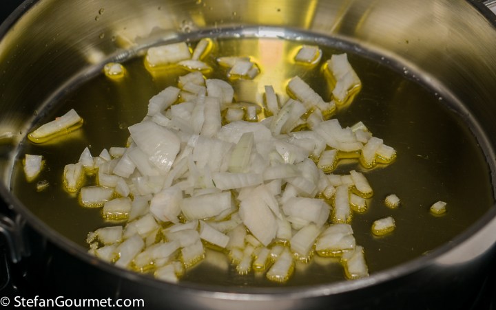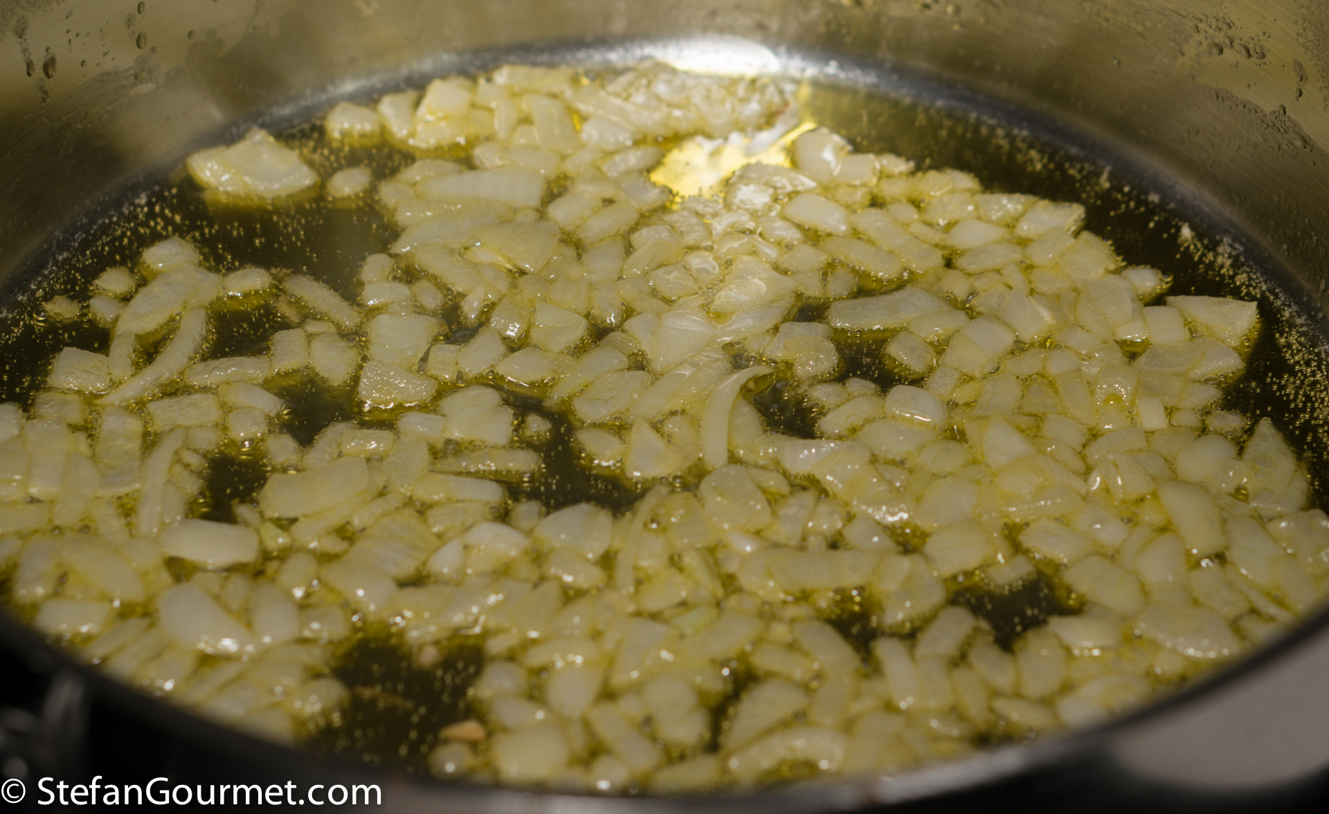 Heat 2 tablespoons olive oil in a frying pan that is large enough to just hold the squid in a single layer (that means a frying pan with a bottom of 28 cm/11 inch). Add a chopped onion and season with salt.