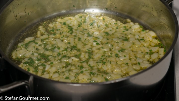 When the onions are soft and golden, add a tablespoon of minced parsley and a minced clove of garlic, and stir briefly.