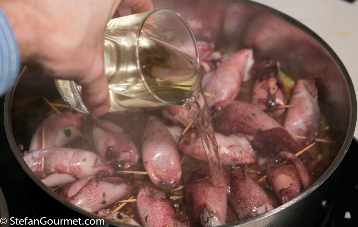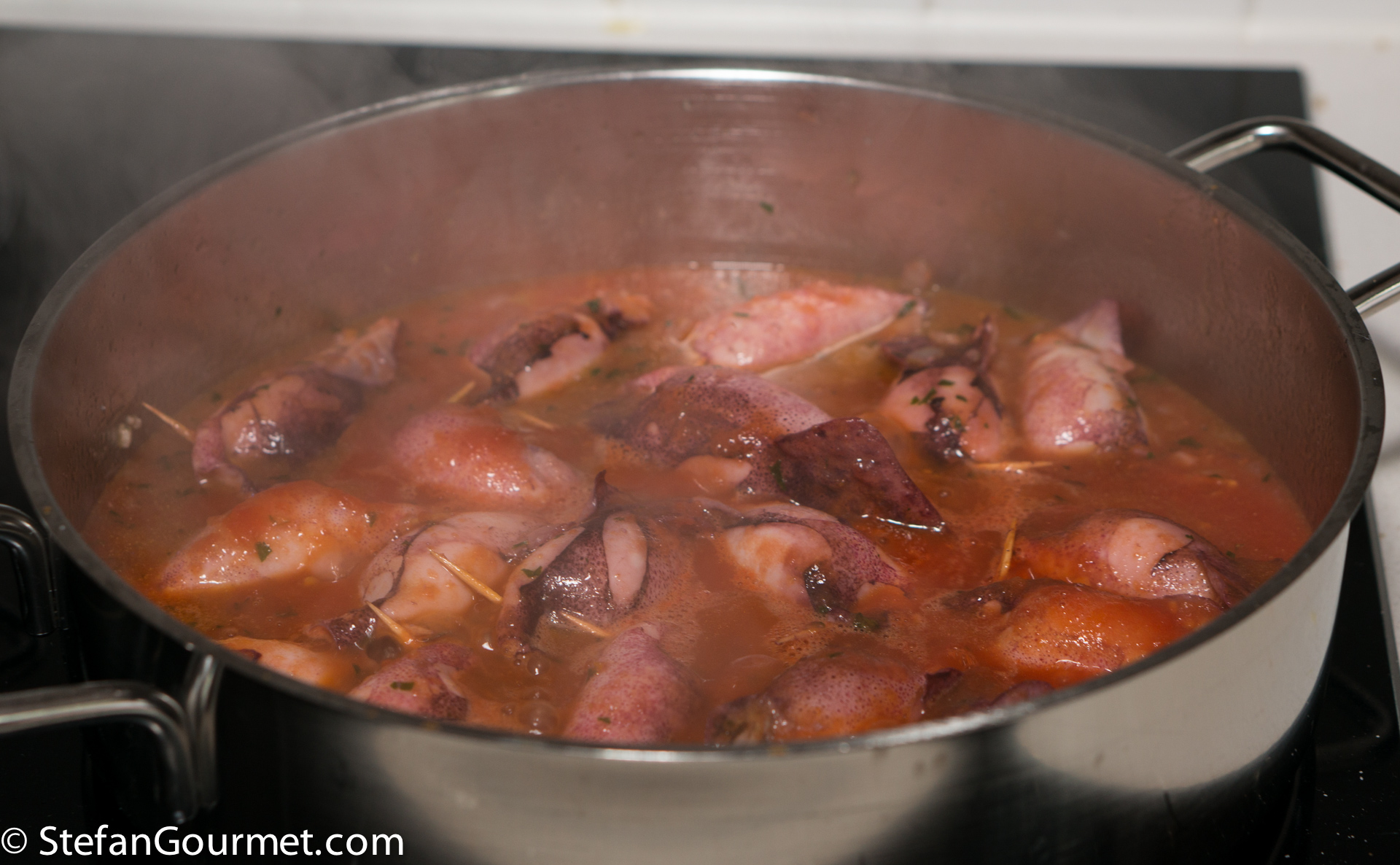 Partially cover the pan. Reduce the heat to a simmer and cook until the squid is tender, about 45 minutes. Turn the squid gently every 10 minutes or so.