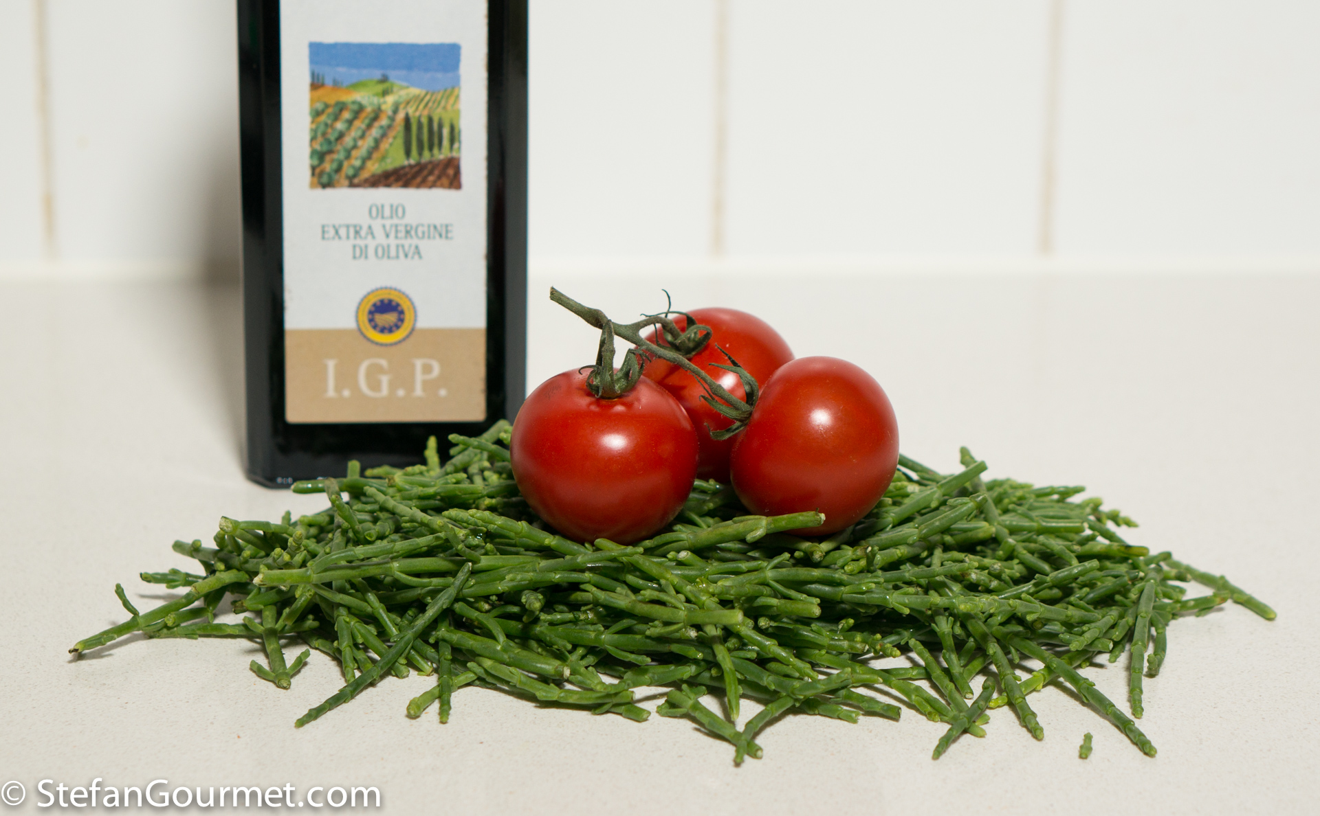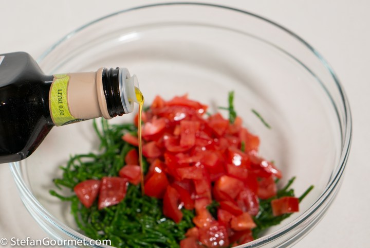 Combine the samphire and tomatoes in a bowl, and add good quality extra virgin olive oil.