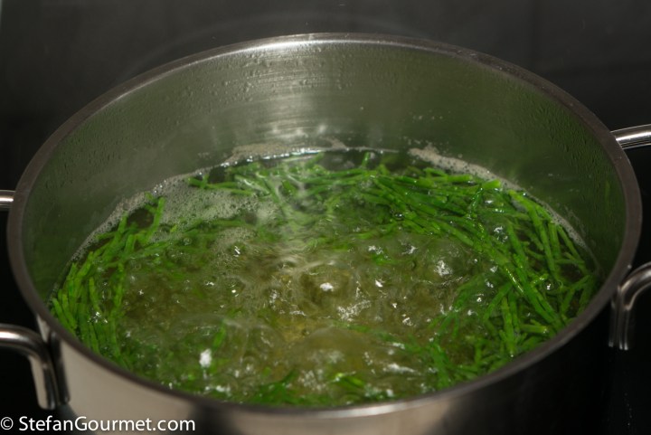 Bring a pot with about 1 litre (4 cups) of water to a boil. Do not add salt to the water, as part of the reason for blanching the samphire is to reduce the amount of salt. When the water boils, add the samphire and blanch until tender but still slightly crunchy, about 2 minutes.