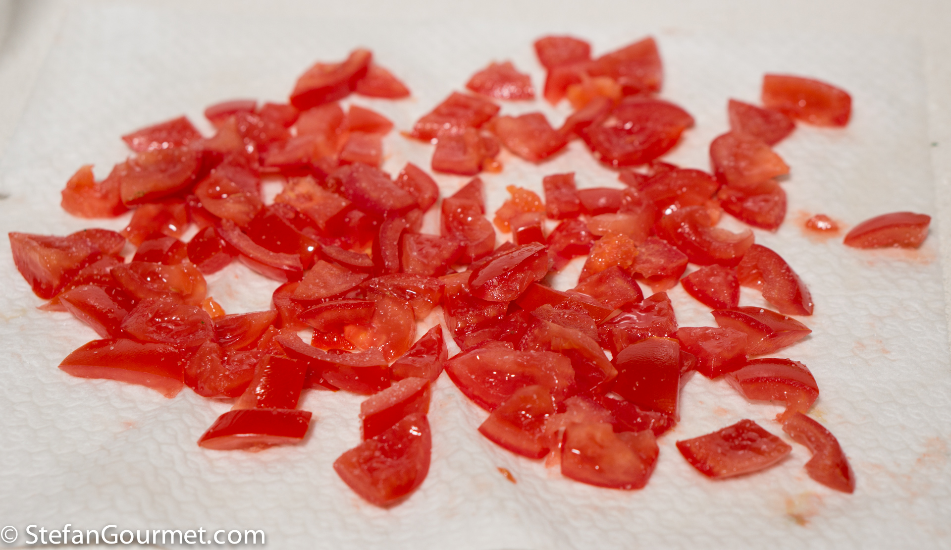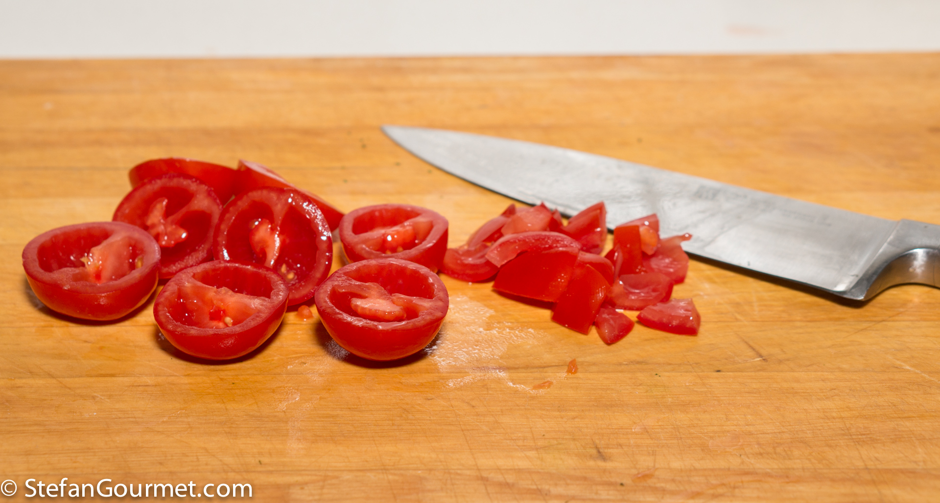 Cut the tomatoes in half crosswise and remove the seeds with your fingers (or a small spoon). Then cut into small pieces.