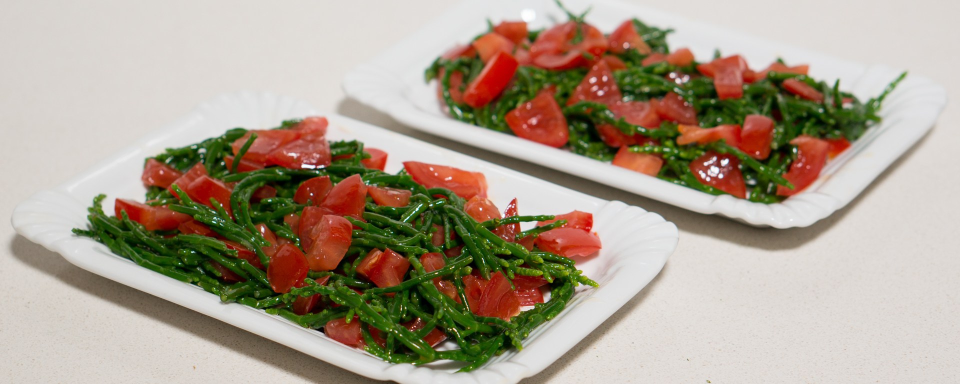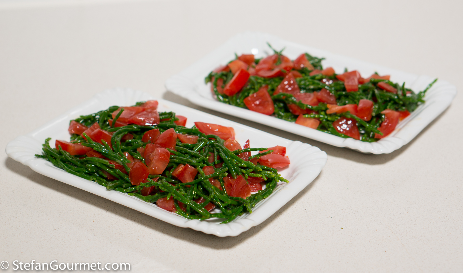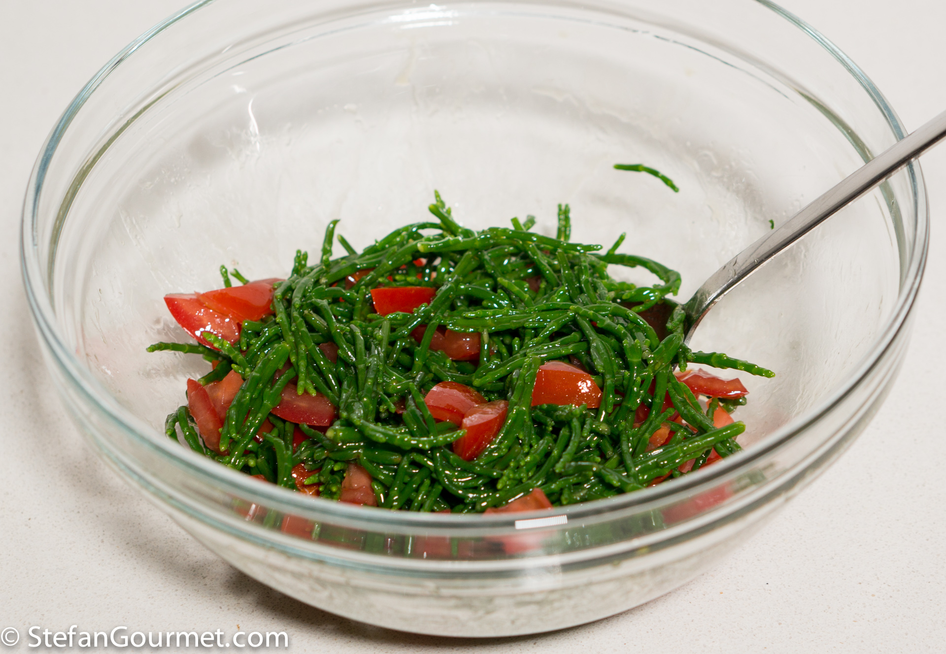 Season the tomatoes lightly with salt (optional). This helps to balance out the flavor between the samphire and the tomatoes. You may want to taste the samphire and tomatoes together before doing this, as the samphire is already quite salty.