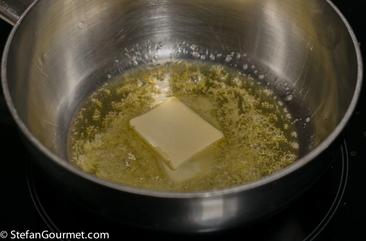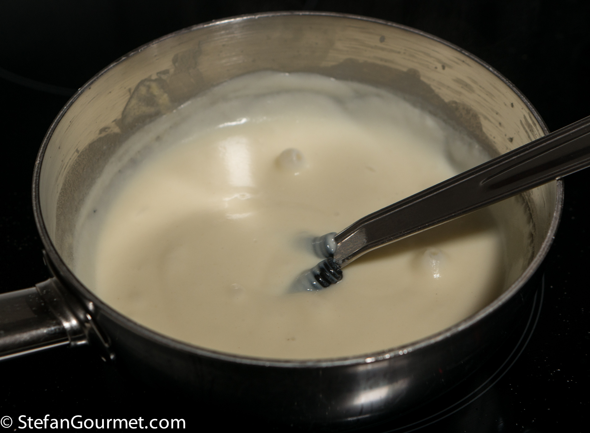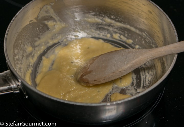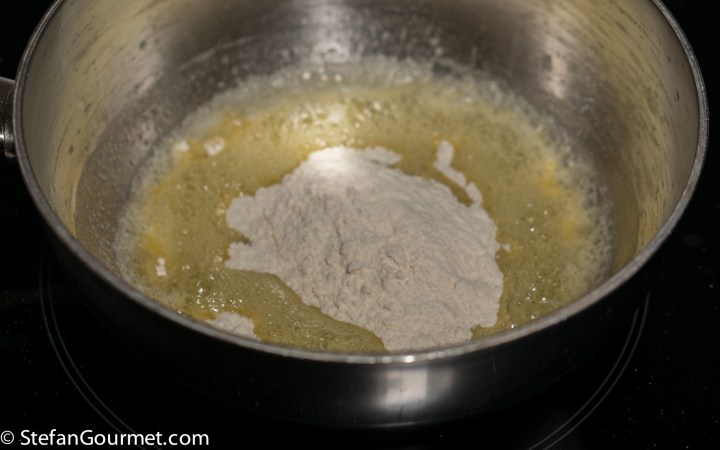 Stir for about a minute over low heat and make sure the butter and flour are well mixed. This is called a roux, which can be used to thicken other sauces as well. It can be cooked longer to make a brown roux, but for a white sauce you will need a white roux. (Many recipes tell you to cook until the roux until it no longer tastes like raw flour, but I have never needed to taste the roux.)
