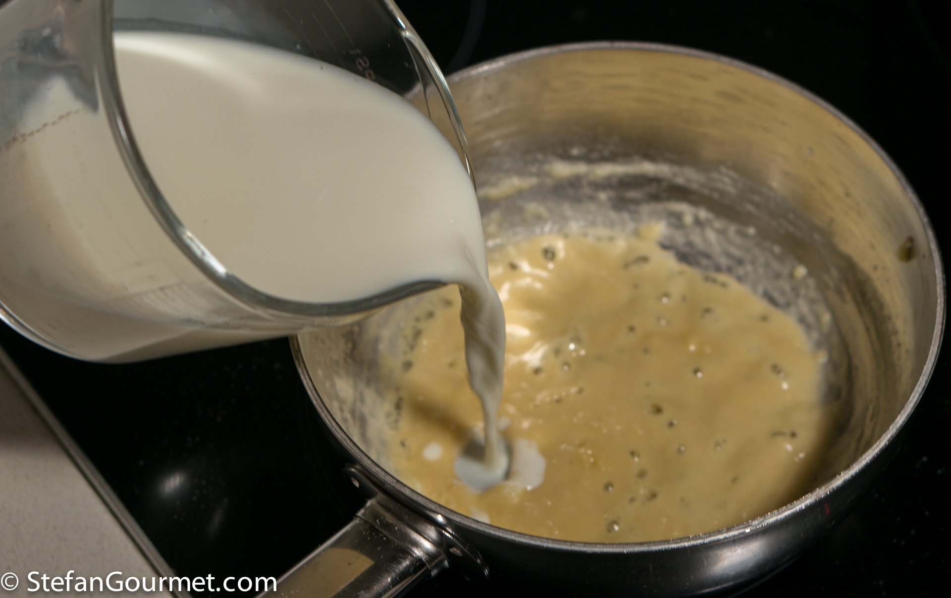 White sauce is known as béchamel in France or besciamella in Italy and is an important basic sauce that is used in many dishes like lasagna. White sauce is made using only three ingredients: milk, butter, and flour. Most recipes will tell you to add the milk slowly while stirring. This is in fact a difficult method with a high risk of lumps and it will take more time. In this post I will teach you a much easier method.