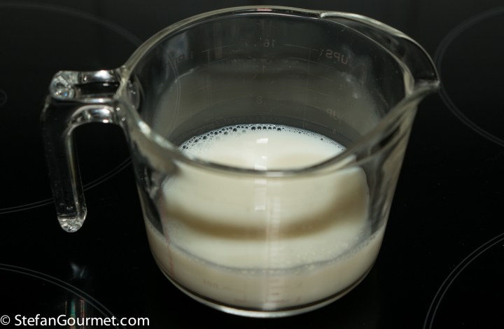 Now you add all the milk at once (either hot or cold, both will work). Be brave, just keep pouring quickly.