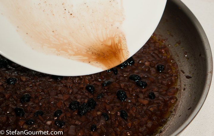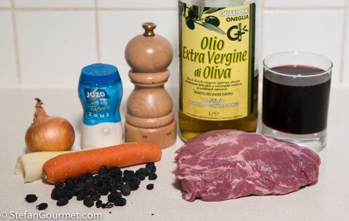 I did not have any cinghiale al mirto in Sardinia, but I did bring home dried myrtle berries. In Sardinia they may also use the greens and fresh berries, but those are hard (if not impossible) to come by here in the Netherlands. Myrtle berries are used to make a liqueur called mirto (recipe coming up once my batch is finished) and they are also used for stews and roasts. To make it even more Sardinian, I decided to cook the wild boar with myrtle berries as well as Cannonau di Sardegna, the island’s most famous red wine (the grape variety is known as grenache noir in France or garnacha in Spain). The neck of wild boar cooked sous-vide in this sauce and then served with it, was absolutely delicious. Since the myrtle berries release all their flavor into the sauce, it is best to discard those and add a fresh batch to the sauce. The recipe for the vegetable side that can be seen in the background will follow soon.