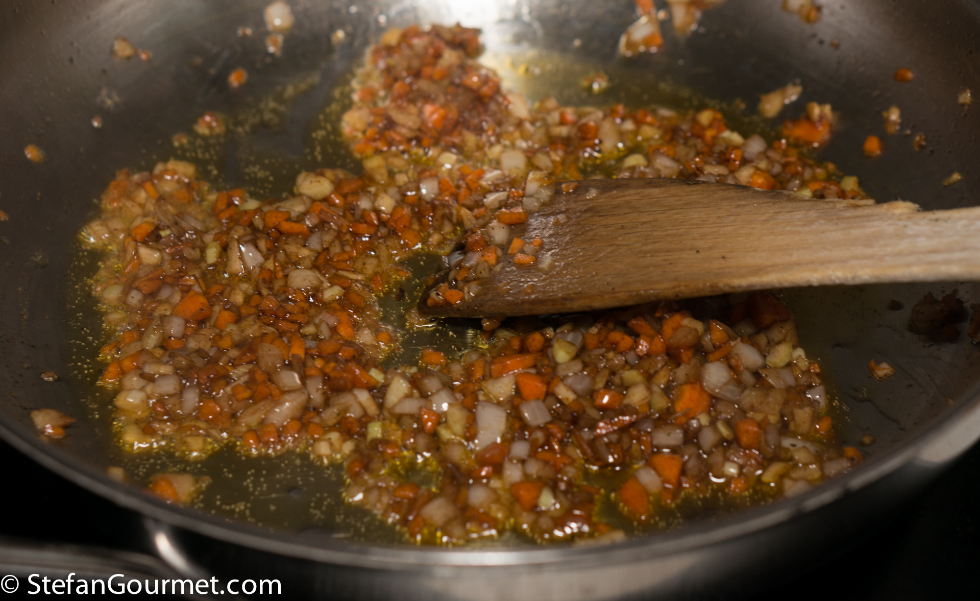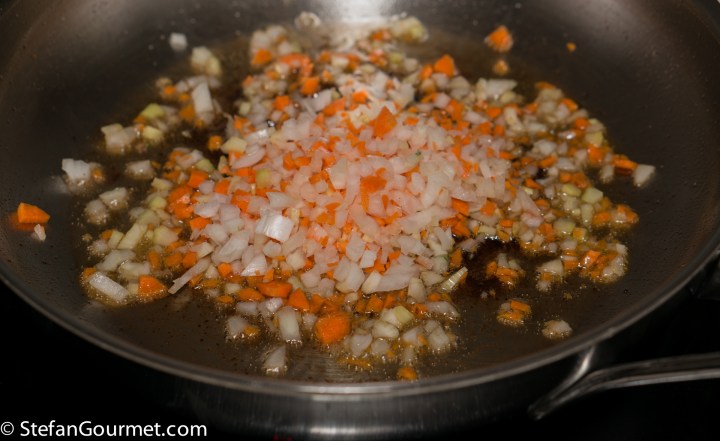 Add minced carrot, celery, and onion to the fat remaining in the frying pan, and season with salt.