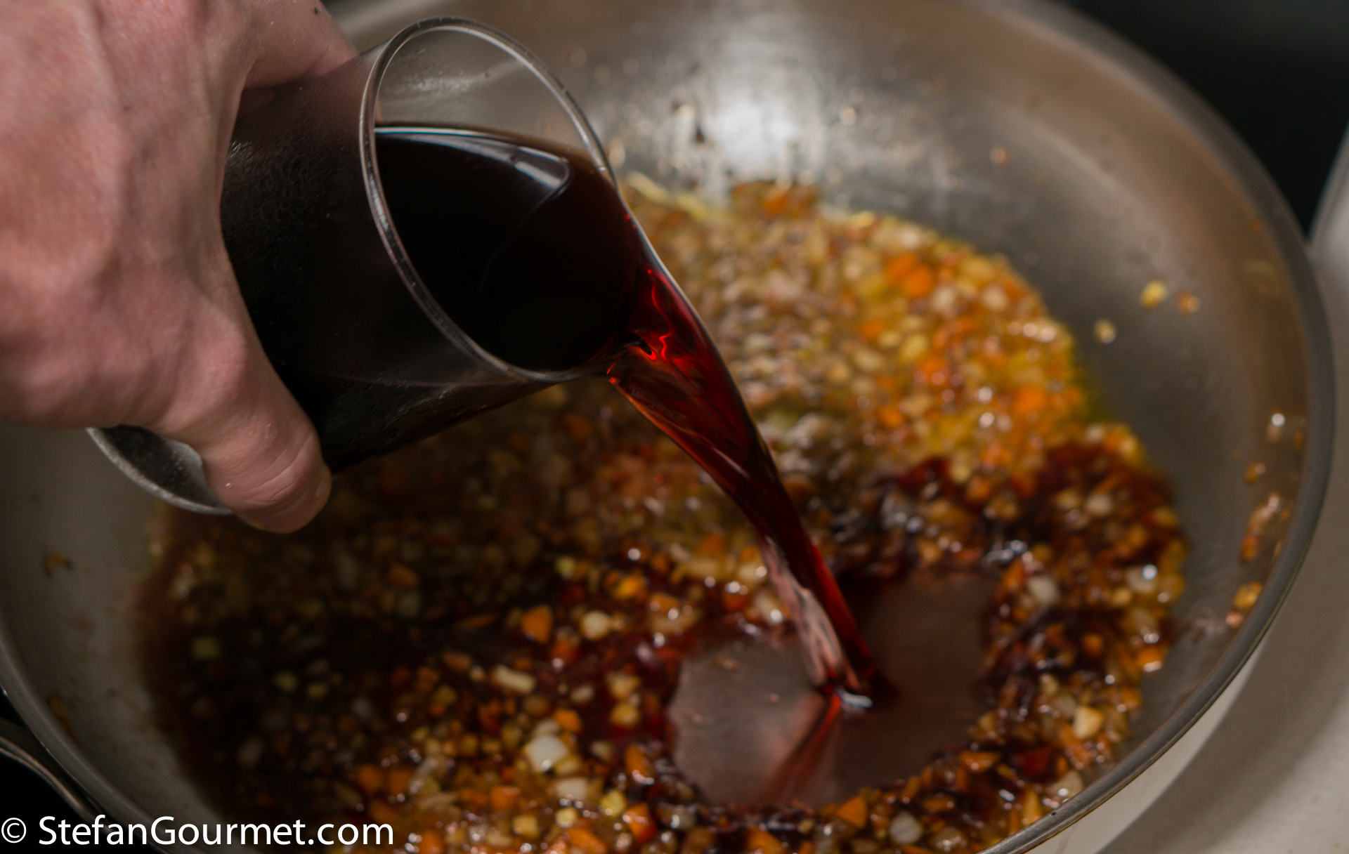 Deglaze with 180 ml of red wine.