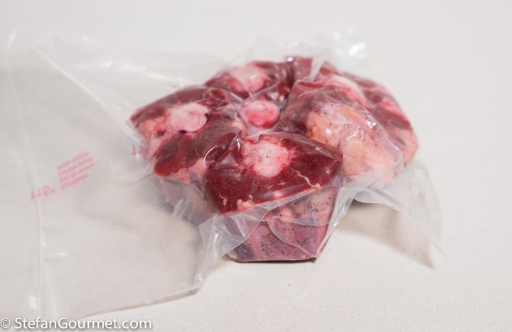 Season the oxtail with salt and freshly ground black pepper. Then vacuum seal, and cook sous-vide for 100 hours (96 hours or 4 days will be fine, too) at 60C/140F.