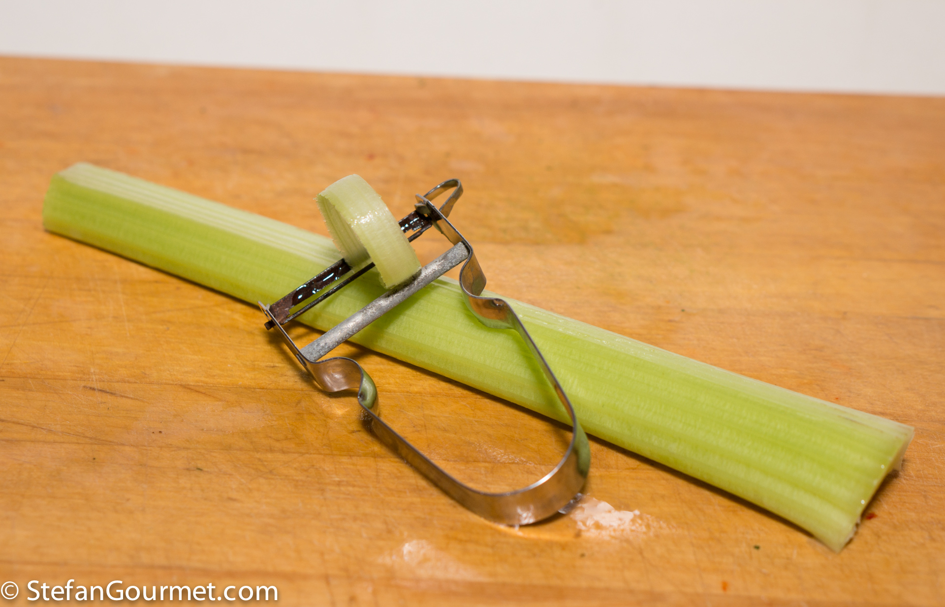 In the meantime, peel the top of the 2 celery stalks to remove the tough fibers, and then cut them into slices.