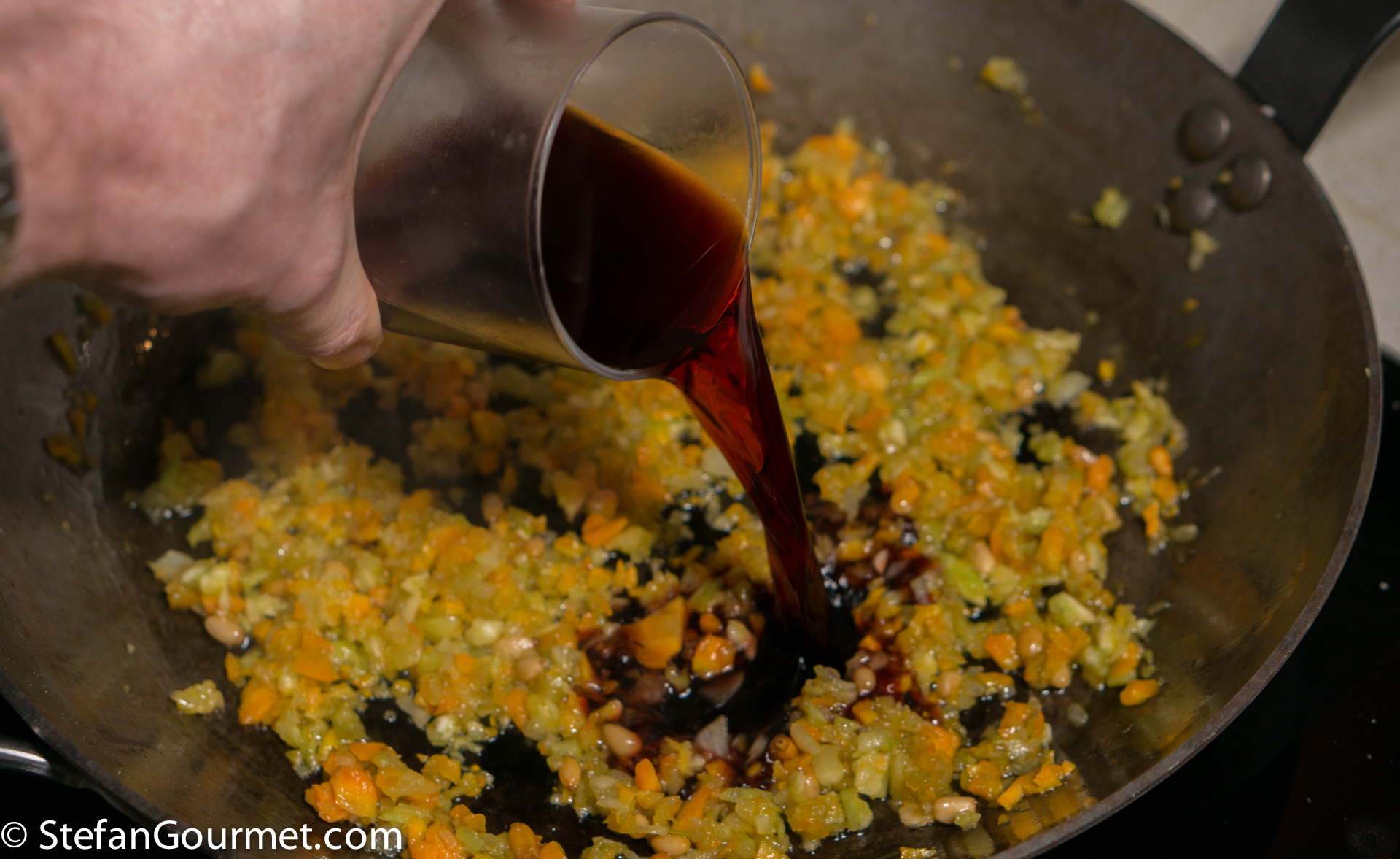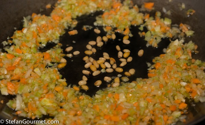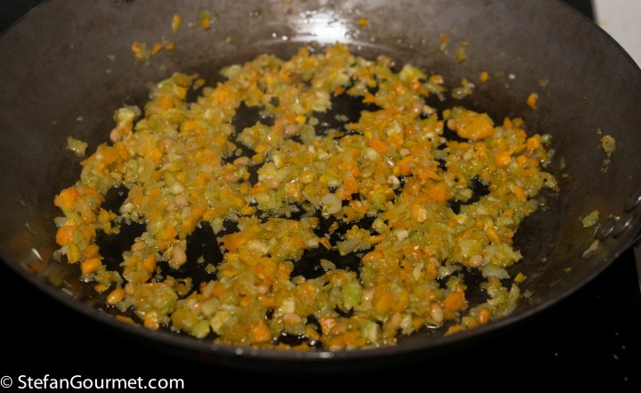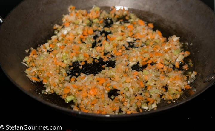 To make the sauce, heat 2 tablespoons olive oil in a frying pan. Add minced carrot, onion, and celery, and season with salt.