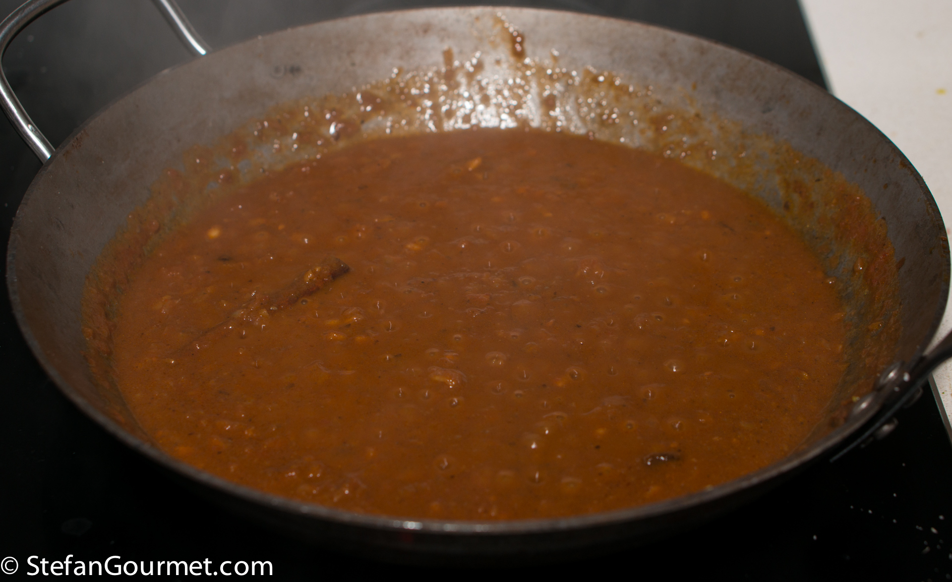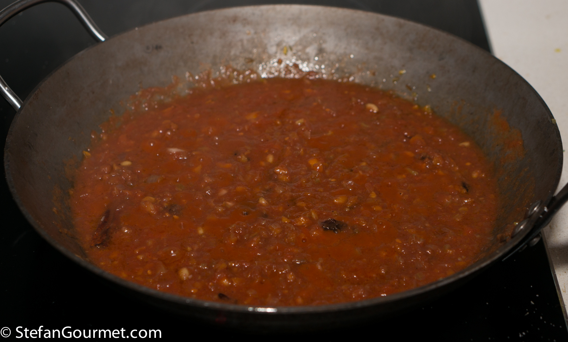 Add 250 ml of peeled tomatoes, pureed in the food processor. Bring to a boil, then reduce the heat to a simmer. Simmer until the sauce has thickened, about 15 minutes.