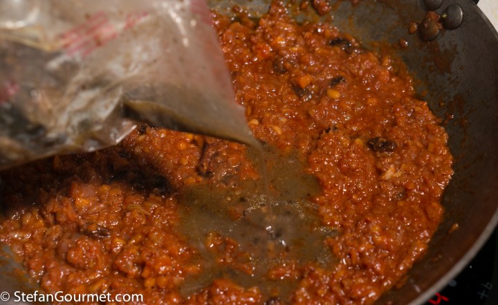 Now take the oxtail out of the sous-vide. Cut open the bag, and add the juices to the sauce.