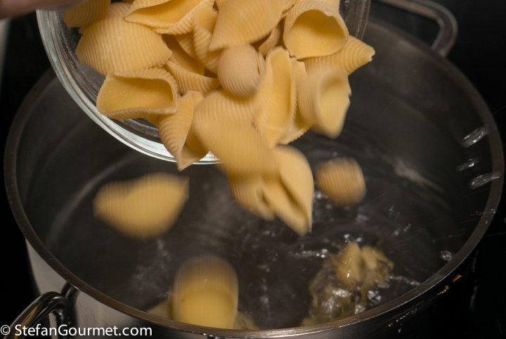 Meanwhile, bring a pot of water to a boil. When the water boils, add salt and the pasta. Set the timer for the time indicated on the package for al dente.