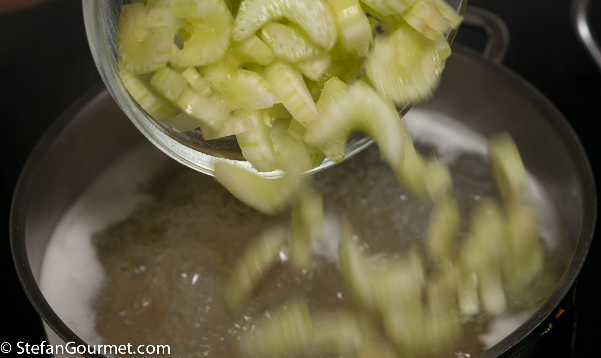 About 3 minutes before the pasta is ready, add the sliced celery to the pot with the pasta.