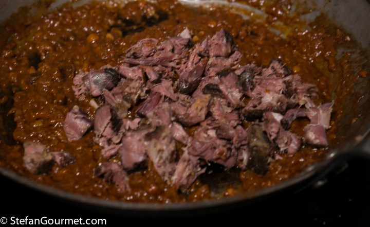 While the pasta cooks, take the meat off the bones (this is easiest with your fingers)…